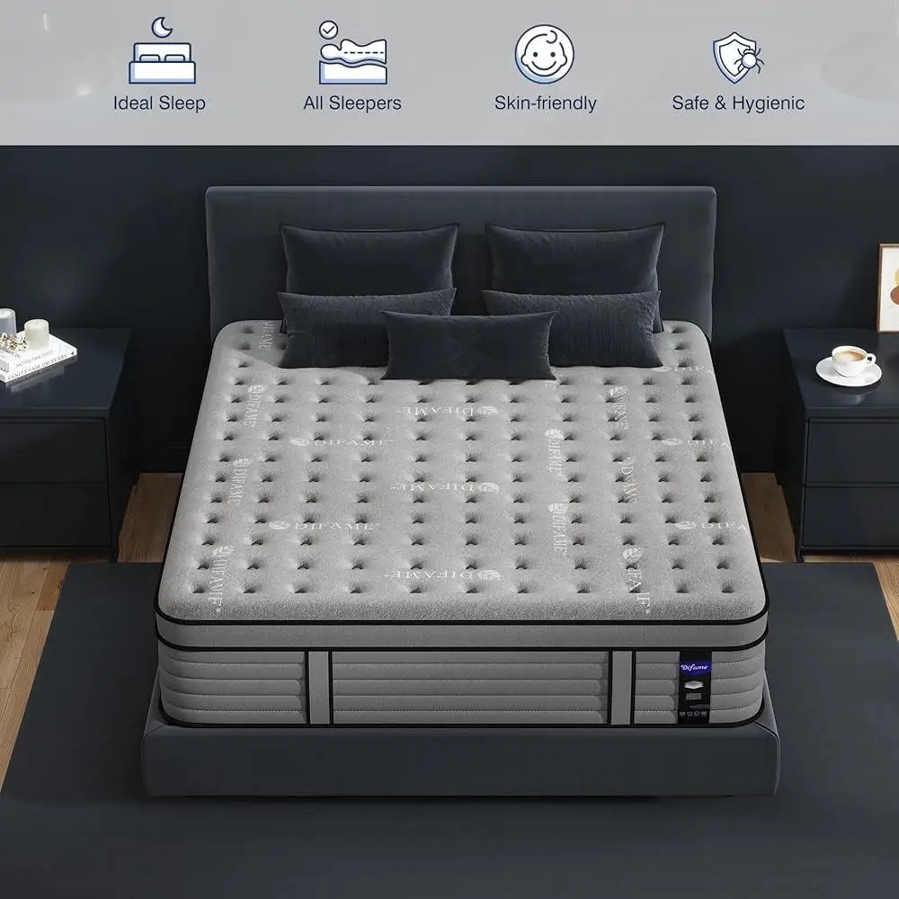 About this item HIGH MATERIAL FOR HEALTH: Skin friendly knitted fabric on the top cover which is breathable and moisture-absorbing, and built in individual pocket coils springs are highly breathable, quickly dissipate body heat, this california king size mattress in a box offers an ideally comfortable sleeping environment for you MOTION ISOLATION FOR UNDISTURBED SLEEP: The DIFAME cal king mattresses use hundreds of individually pocket coils springs, each providing personalized support from head to toe,also it tends to reduce noise and isolate motion when you move, effectively avoid movement interference between partners, create a quiet and undisturbed sleep with this hybrid memory foam mattress ENHANCED EDGE SUPPORT: The california king hybrid mattress provides 3 layer coils to enforce the edge innerspring firmness, providing durability, exceptional body contouring, and edge to edge support, making it less likely to sag or collapse, avoid the feeling of falling, and give better protection for you and your families CALIFORNIA KING MATTRESS IN A BOX: The mattress is vacuum packed in a box, cal king size mattresses measure 84" L x 72" W x 12" H and support a maximum weight of 1500 lbs. please wait 24 to 72 hours to ensure it fully rebounds and the smell dissipates. This mattress fits most bed frames RELIABLE PURCHASE: DIFAME hybrid mattress cal king purchase includes a 100 night trial and 10 year after sales support, providing you with reassurance.