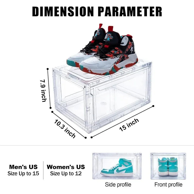 - 【Professional Grade Shoe Display Case】Our sneaker storage box is made of heavy duty material PET and acrylic.Strong and durable,Which can accommodate AJ, sneakers, Canvas, high-top shoes, heels, even boots, and other larger sizes.Each shoe box is 15"(L) x 10.3"(W) x7.9"(H),and can fit up to US size 15 shoes.