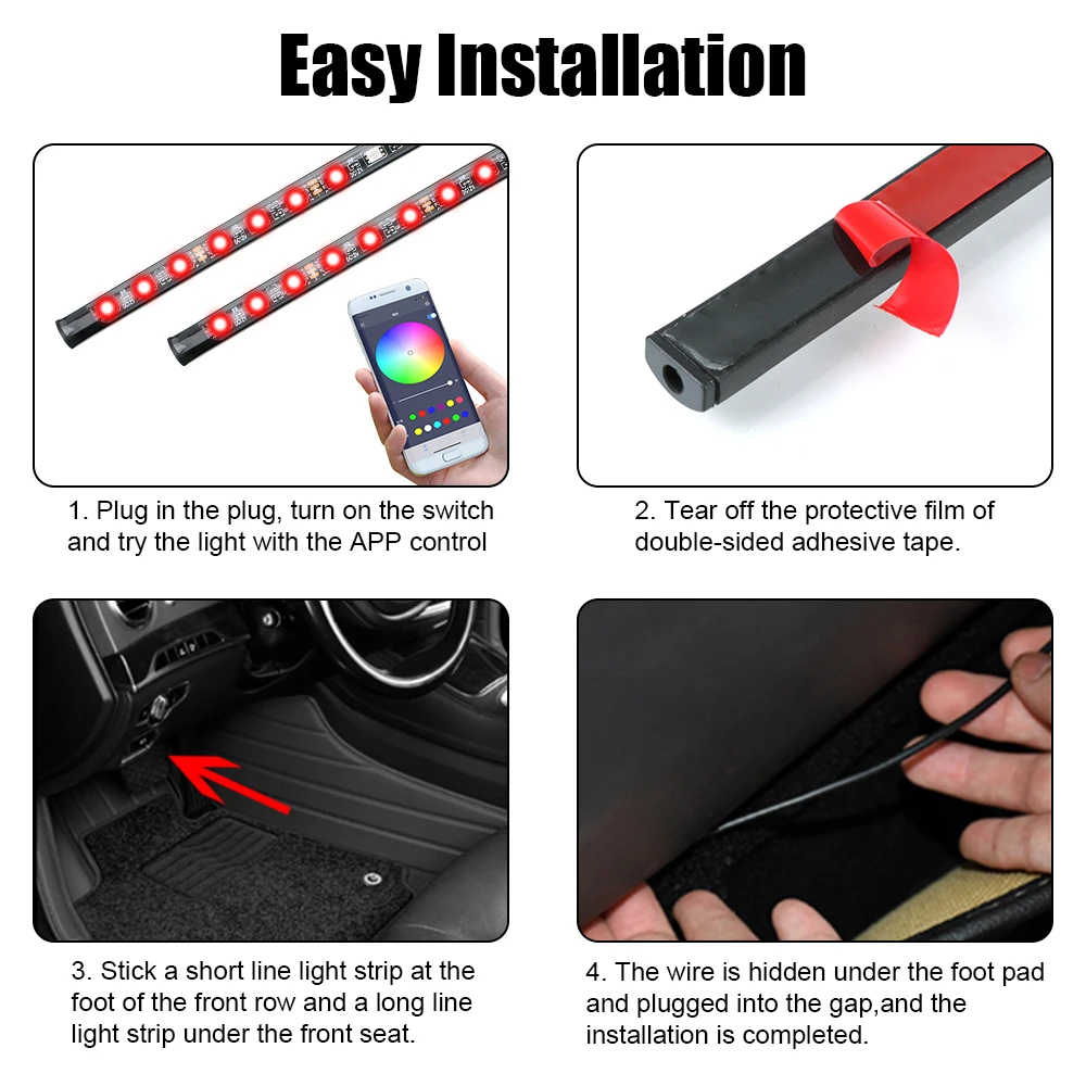 12V RGB Lights Bluetooth LED Strips Car Interior Ambient Lamp Foot Seat Door Decorative Set Smart Control Automotive Accessories