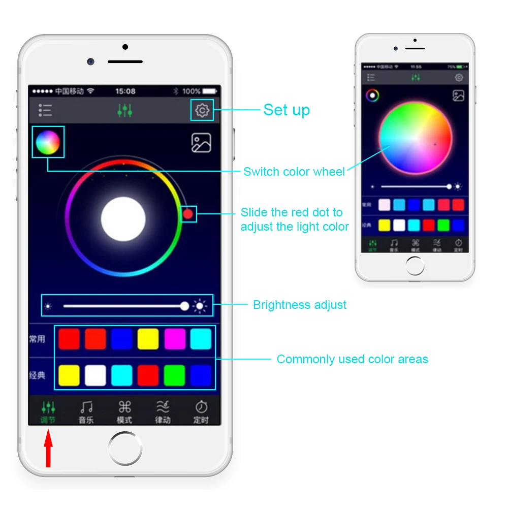 Control functions: 2 music control modes, 360° color wheel color control, brightness control, ON/OFF, single color gradient, single color strobe, two-color merge gradient, two-color merge strobe, three-color gradient, three-color jump, 7-color gradient, 7-color jump, timing switch, custom color.