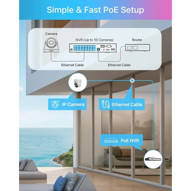 [Easy PoE Connection] Your home security camera system can be set up and installed faster with a simple PoE connection. Compared to CCTV DVR systems, the video from an IP camera system is not compromised by cables or degraded in quality. Through the Ethernet cable, the digital signal will remain true to the 8MP HD image.