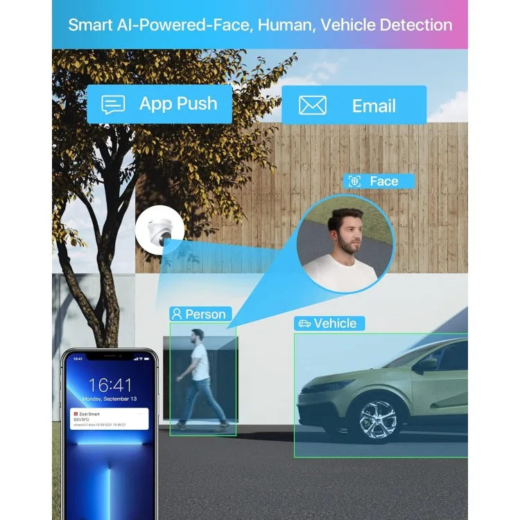 [Person Vehicle Detection with Alert Push] The person vehicle detection feature can intelligently distinguish between people or vehicles or other objects, and safely reduce unnecessary notifications. Whenever a motion event is detected, you will instantly receive push notifications via Zosi Smart app and email alerts.