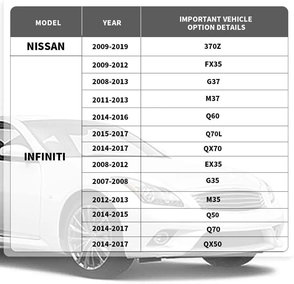 * 【Compatible with】NISSAN 370Z,INFINITI G25 G35 G37 Q40 Q50 Q60 Q70 EX35 EX37 QX50 QX70 FX35 FX37.