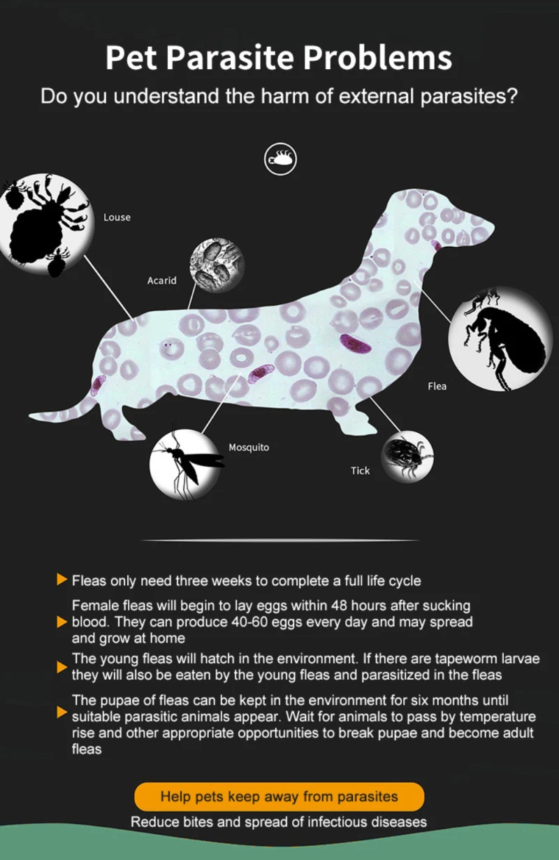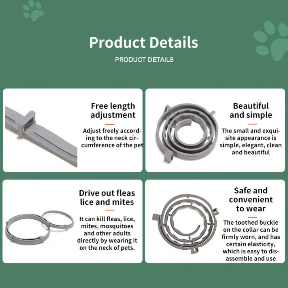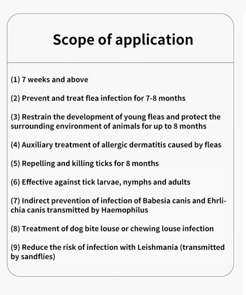 2. It can directly exert its efficacy by wearing it on the neck of pets to kill infested fleas, lice, mites, mosquitoes and other adults.