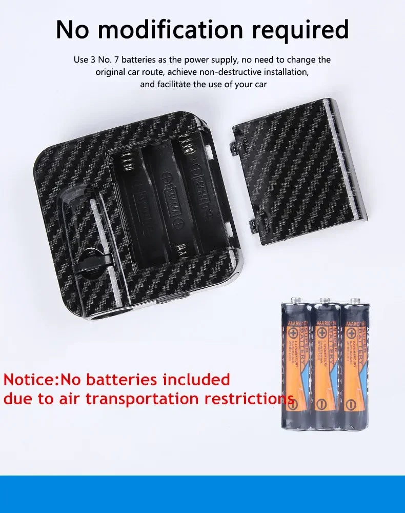 Using three No. 7 batteries as the power supply is sufficient, without the need for any changes to the original vehicle wiring, achieving non-destructive installation. (The battery is not included in the package and cannot be charged due to limitations in air transportation conditions.)