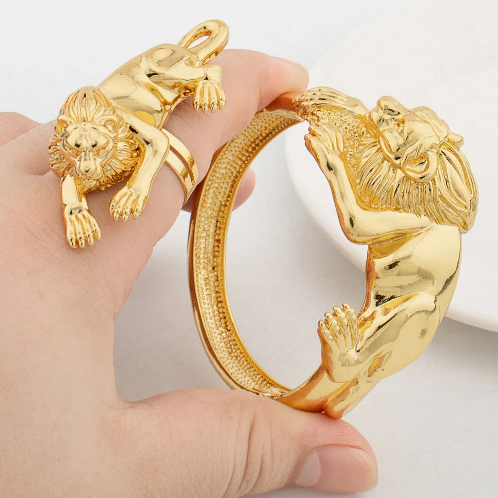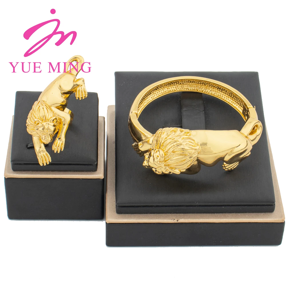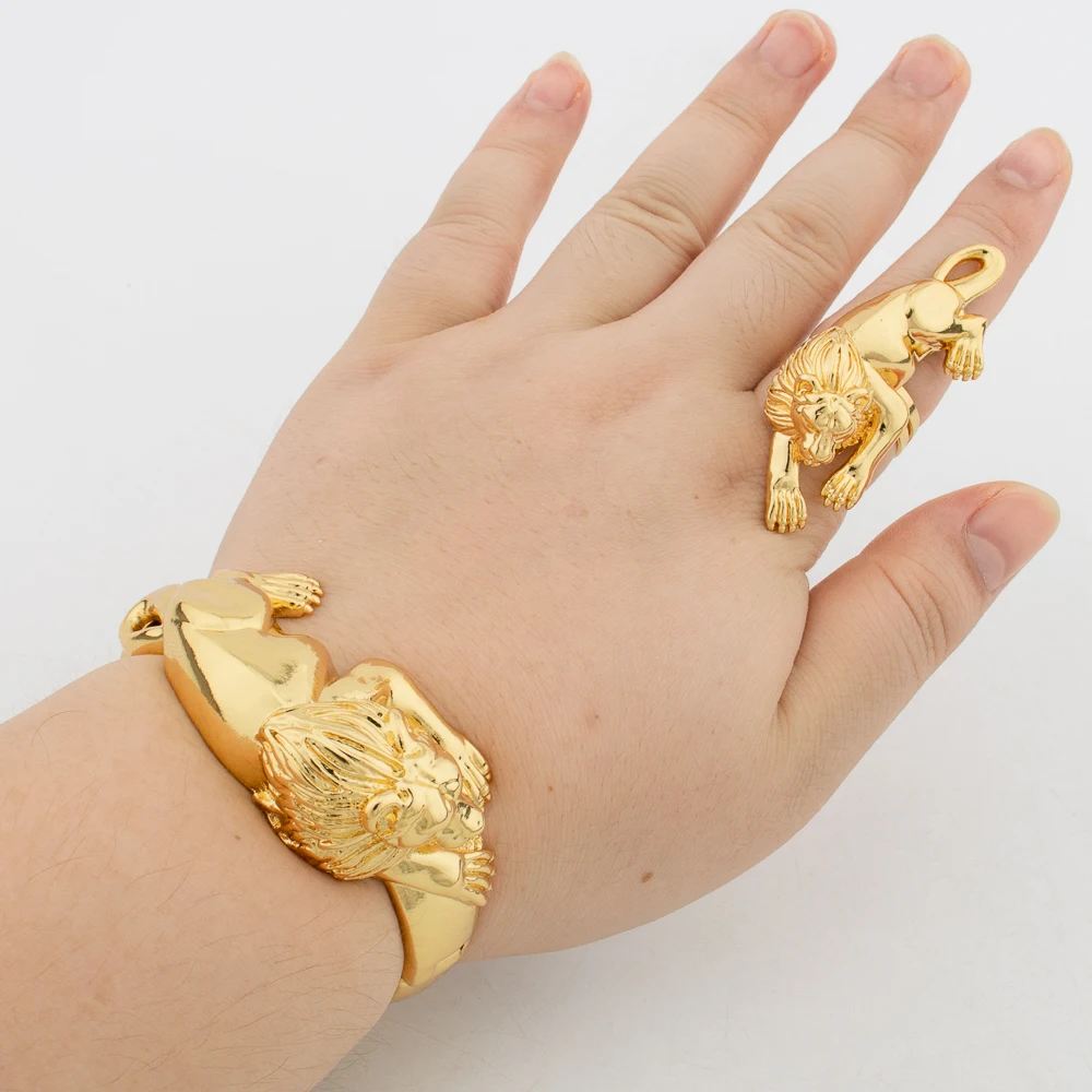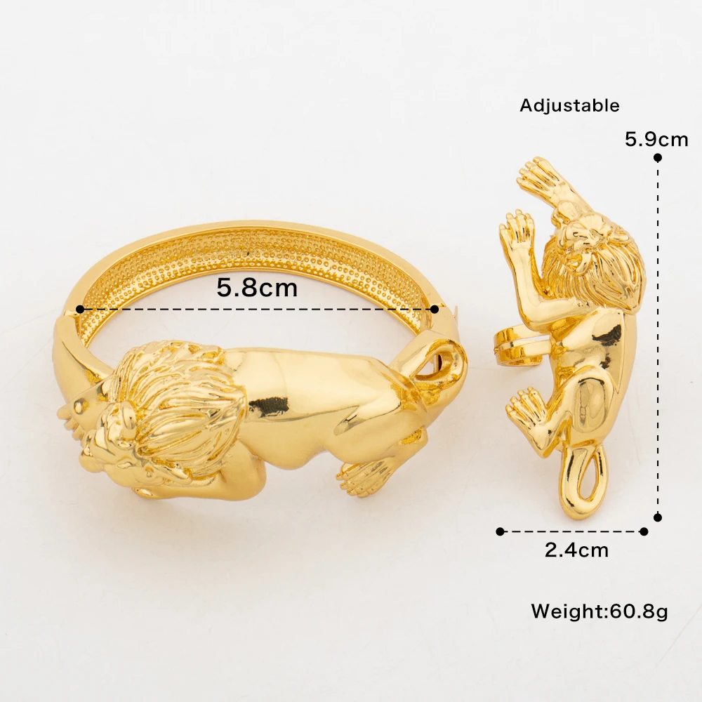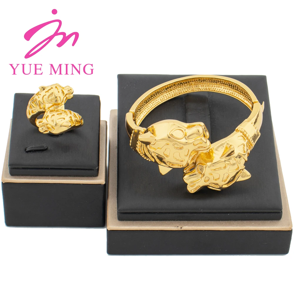 2PCS Jewelry Sets Charm Cuff Bangle with Ring Wedding Party Leopard Bracelet Women Dubai Gold Color Adjustable Ring Jewelry Gift