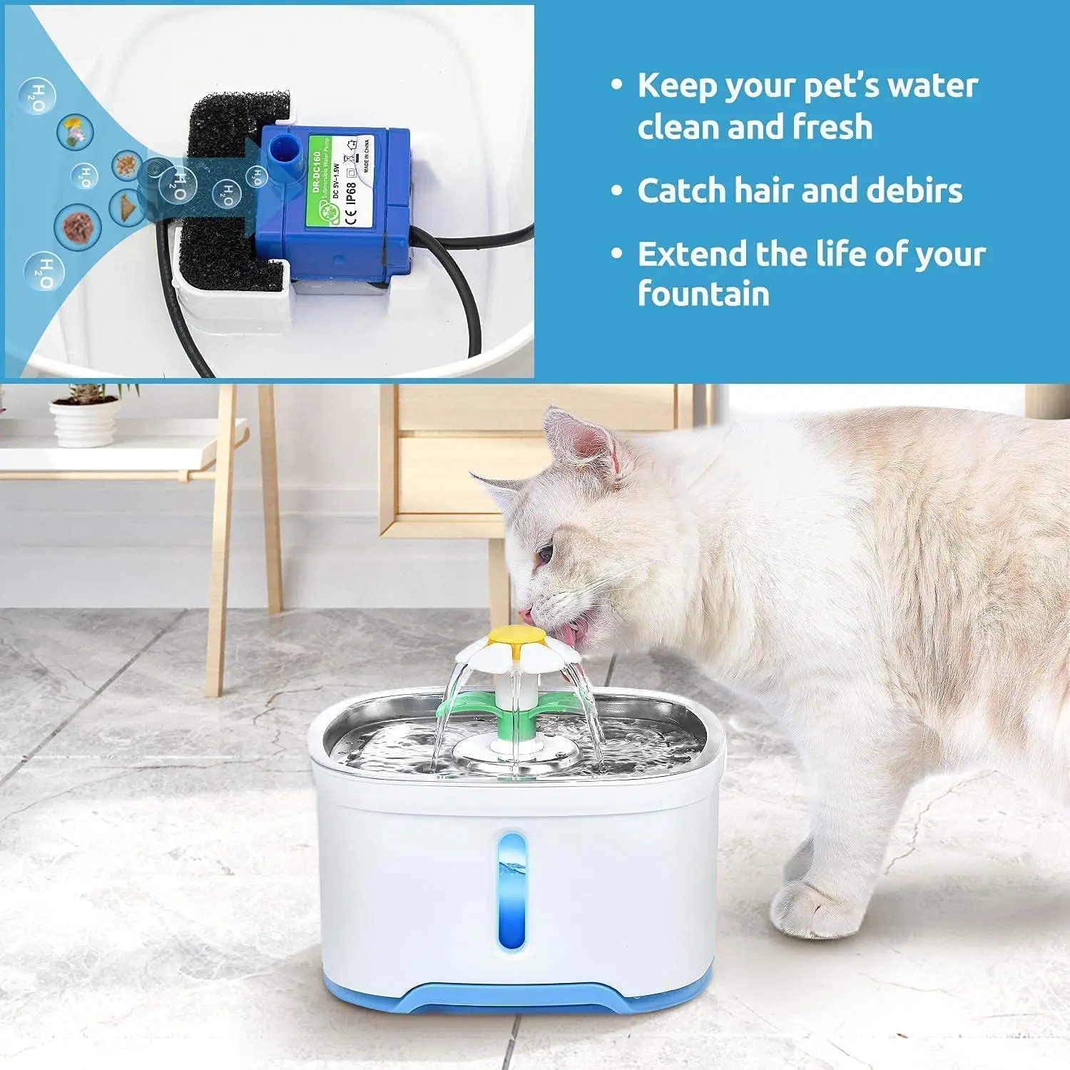 【Healthy Filter Sponge】Each filter is composed of activated carbon, ion exchange resin and non-woven fabric. They can filter hair, heavy metals, and improve the taste of the water so that pets can drink clean and fresh water all day, which helps to increase water consumption and reduce the risk of urinary tract infections.