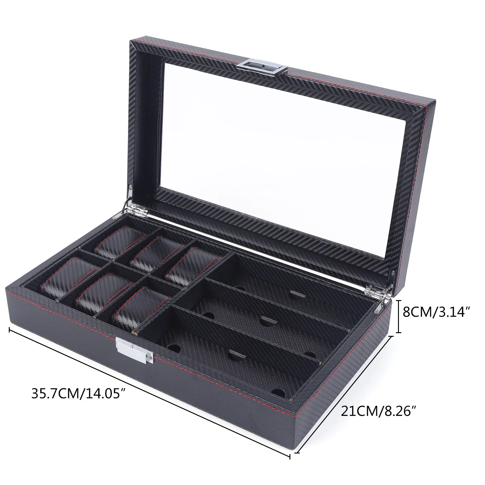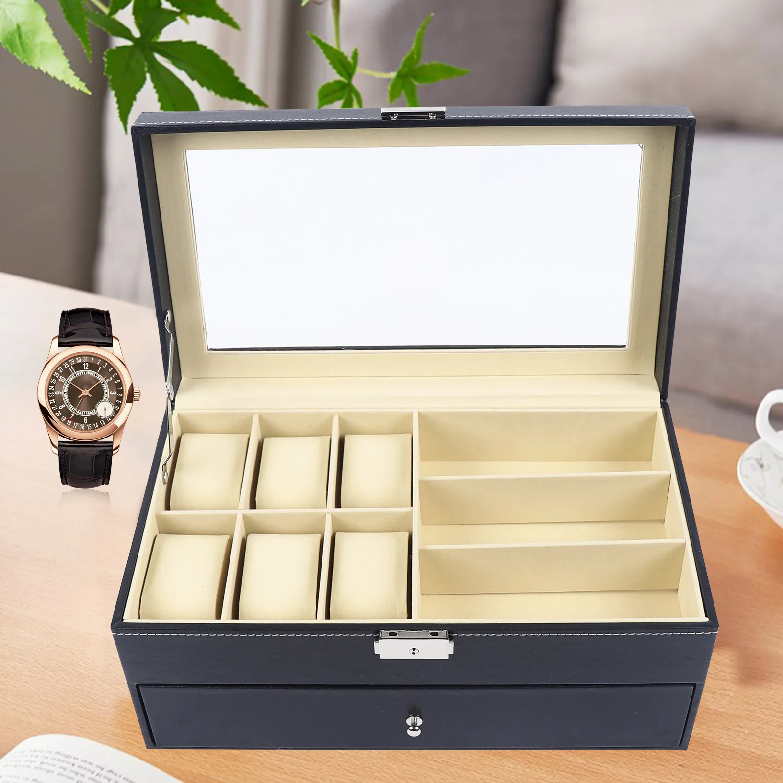 - 6 watch slots and 3 compartments for watches,glasses, sunglasses and Suits for storing jewelry, cuff links,rings,earrings,bracelets and necklaces