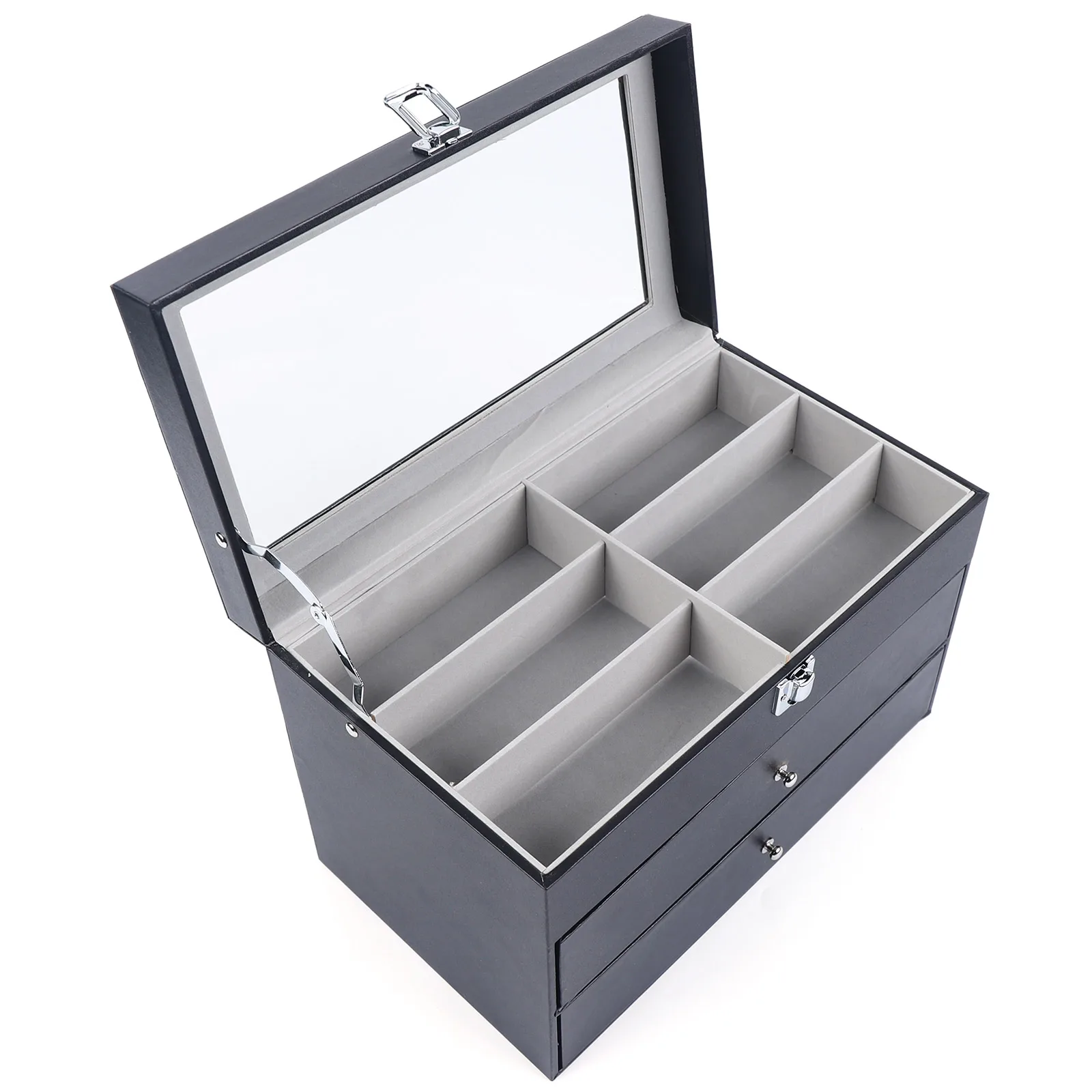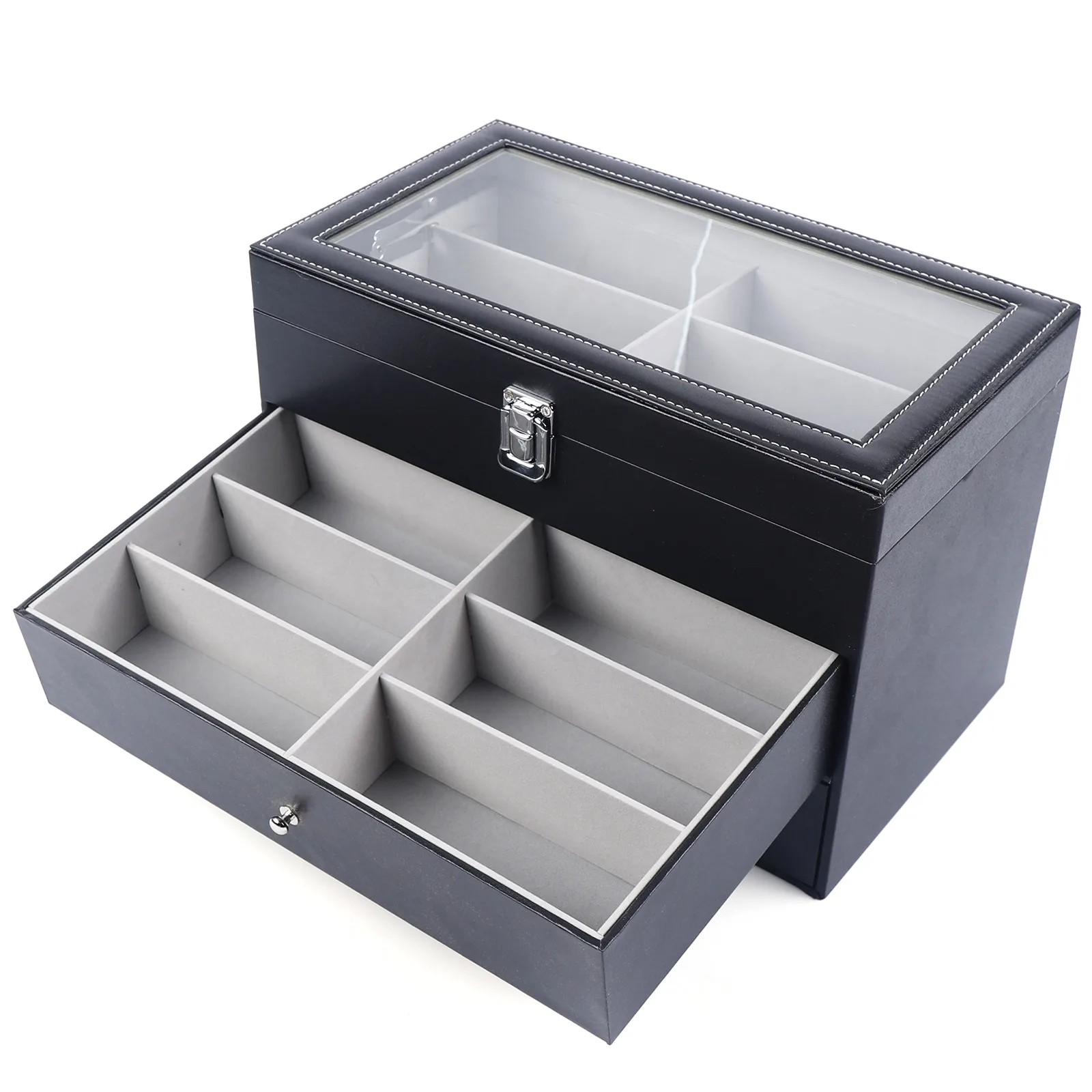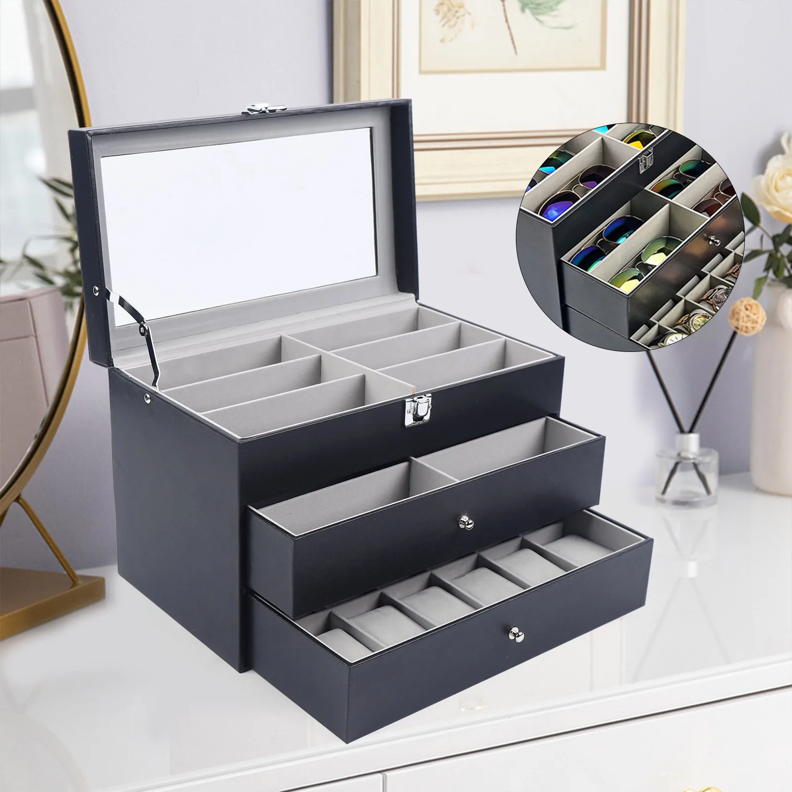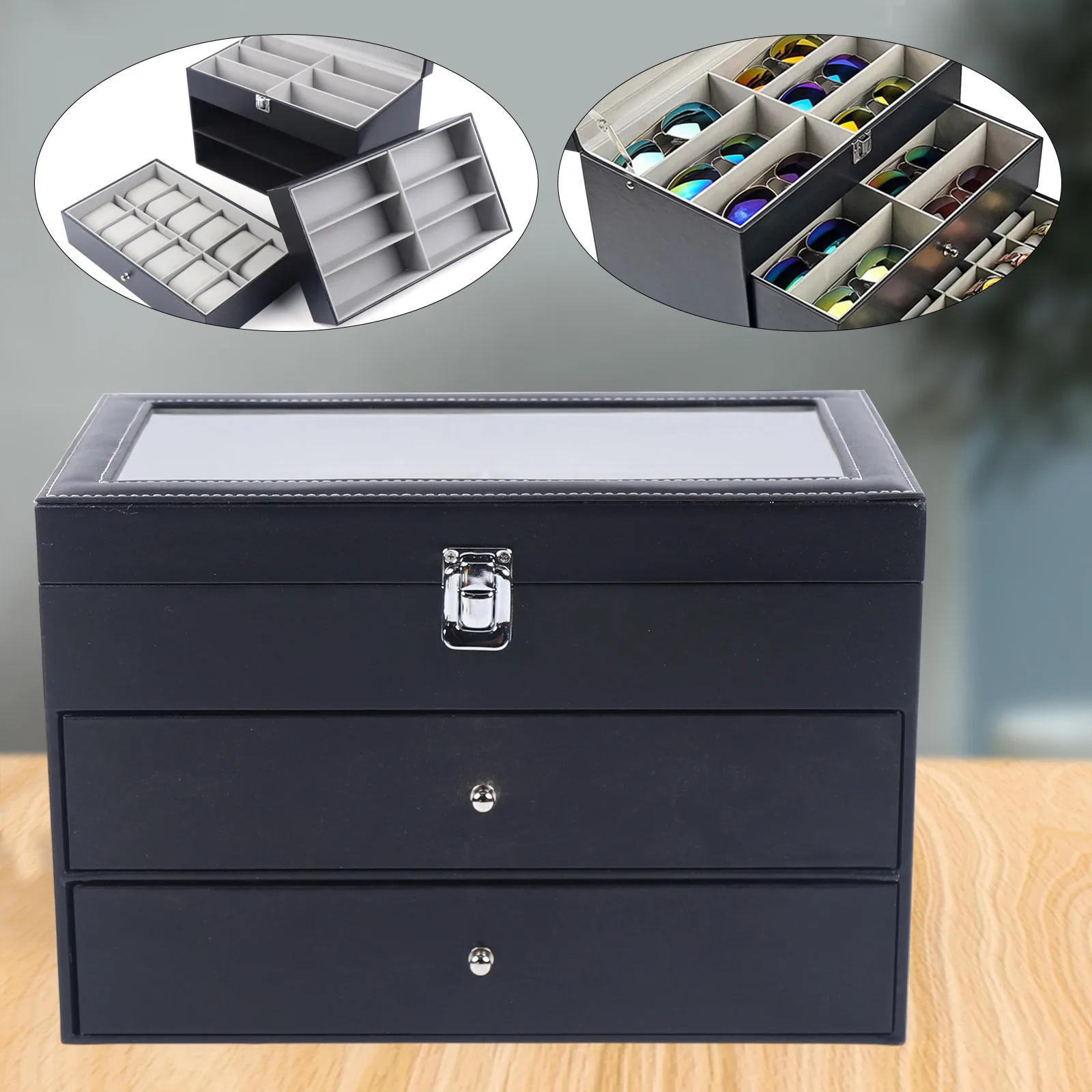 - Metal Lock,Black High Grade PU Leather surface,Two levels,First level includes 6 removable velvet pillows and 3 pairs of glasses,second level includes 6 separate compartments to keep your sunglasses and glasses organized