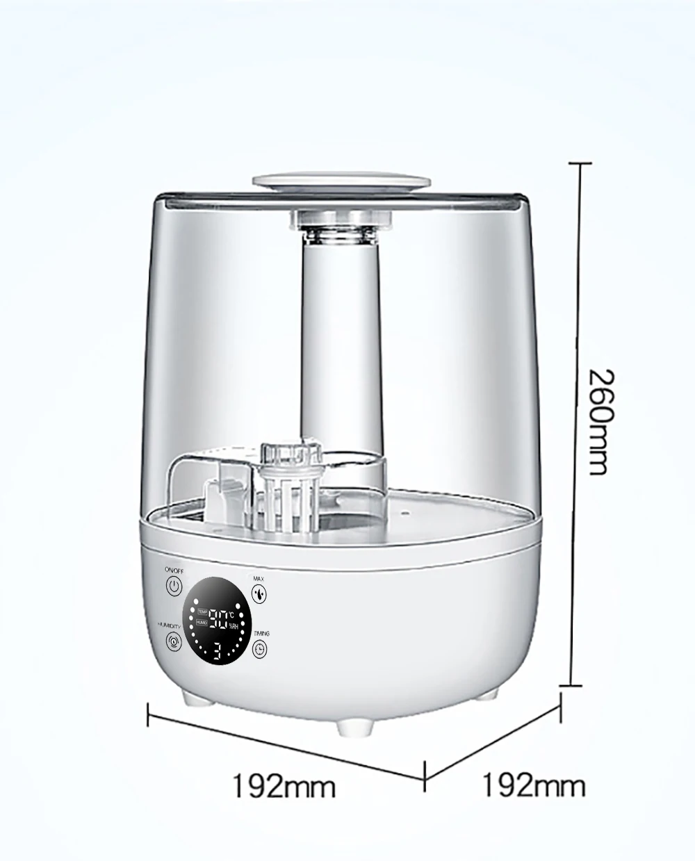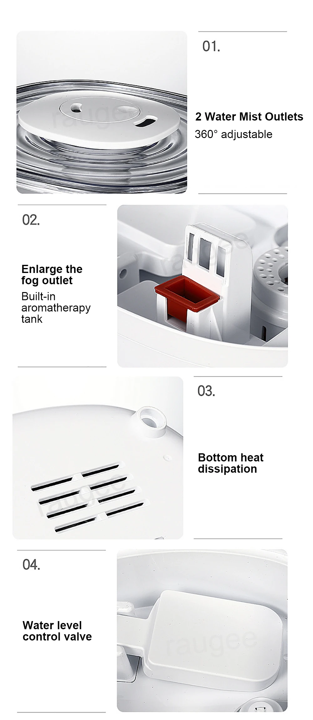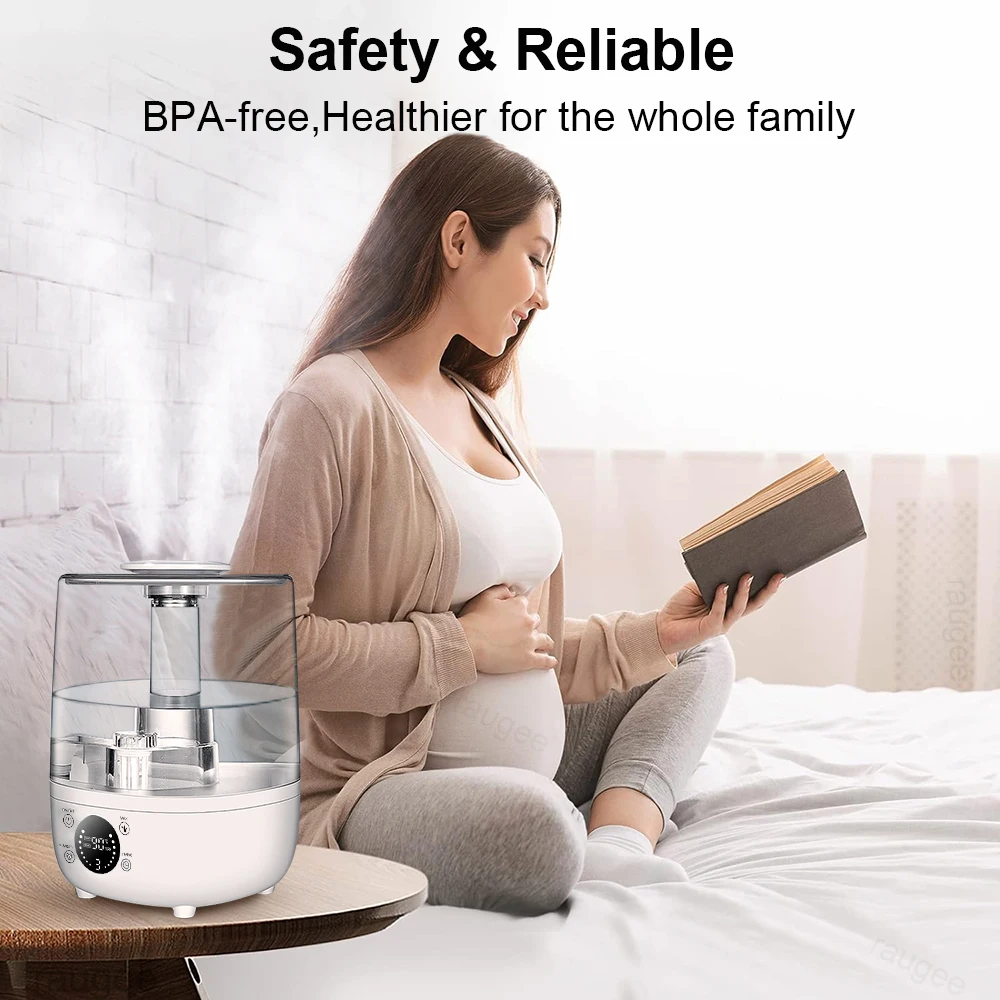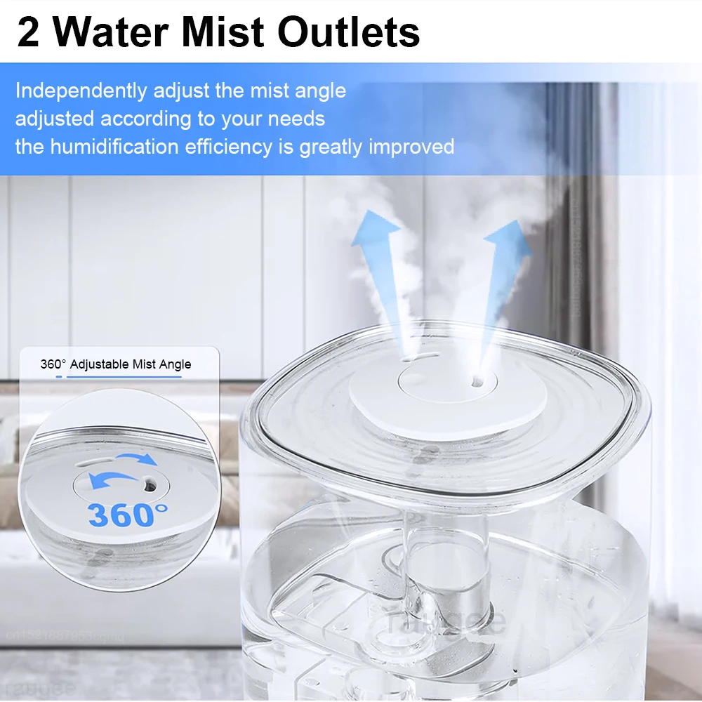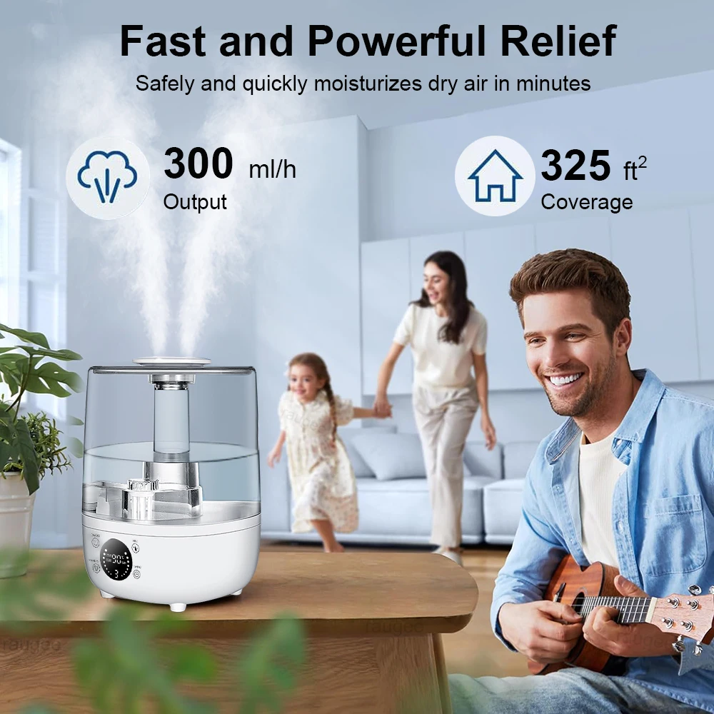 Powerful Mist & Features: The humidifier is equipped with an upgraded dual mist outlets to widen and heighten the mist coverage. It's like being in a cloud. The highest mist output can reach 300ml/h, easily raising humidity by 10% in just 20 minutes. Quickly regulate the humidity throughout your room for relief from congestion, coughs, cold-like symptoms, allergies, dry skin, and sinus issues.