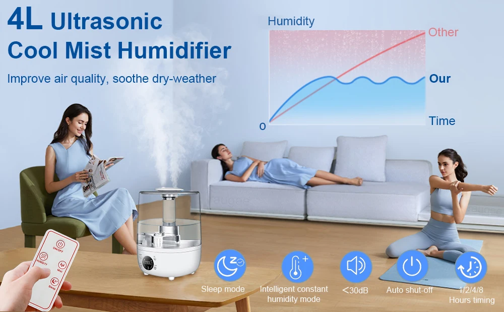 Quietly humidify for 40 hours: Our air humidifier for large room barely makes any sound (Noise Level: < 30dB). This cool mist humidifier has 3 levels of mist output that you can fully customize according to your preferences.A large 3L/4L water tank allows the humidifiers for bedroom to operate continuously for up to 40 hours on a low setting without the need for frequent refills! We set the humidifier to automatically shut down without water. This humidifier for baby is ideal for use in the bedroom, parlor, office, or other spaces where noise levels need to be kept low.