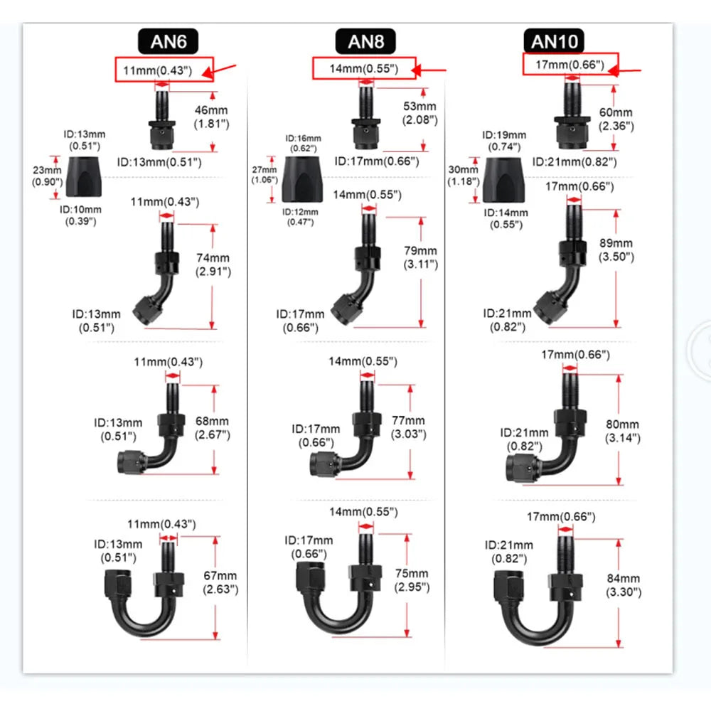 AN6, AN8, AN10 not means 6mm, 8mm, 10mm. Which corresponds to the inner diameter of the tubing were 8.7mm, 11.11mm, 14.2mm. Therefore, when purchasing products, be sure to pay attention to the inner diameter of the tubing.
