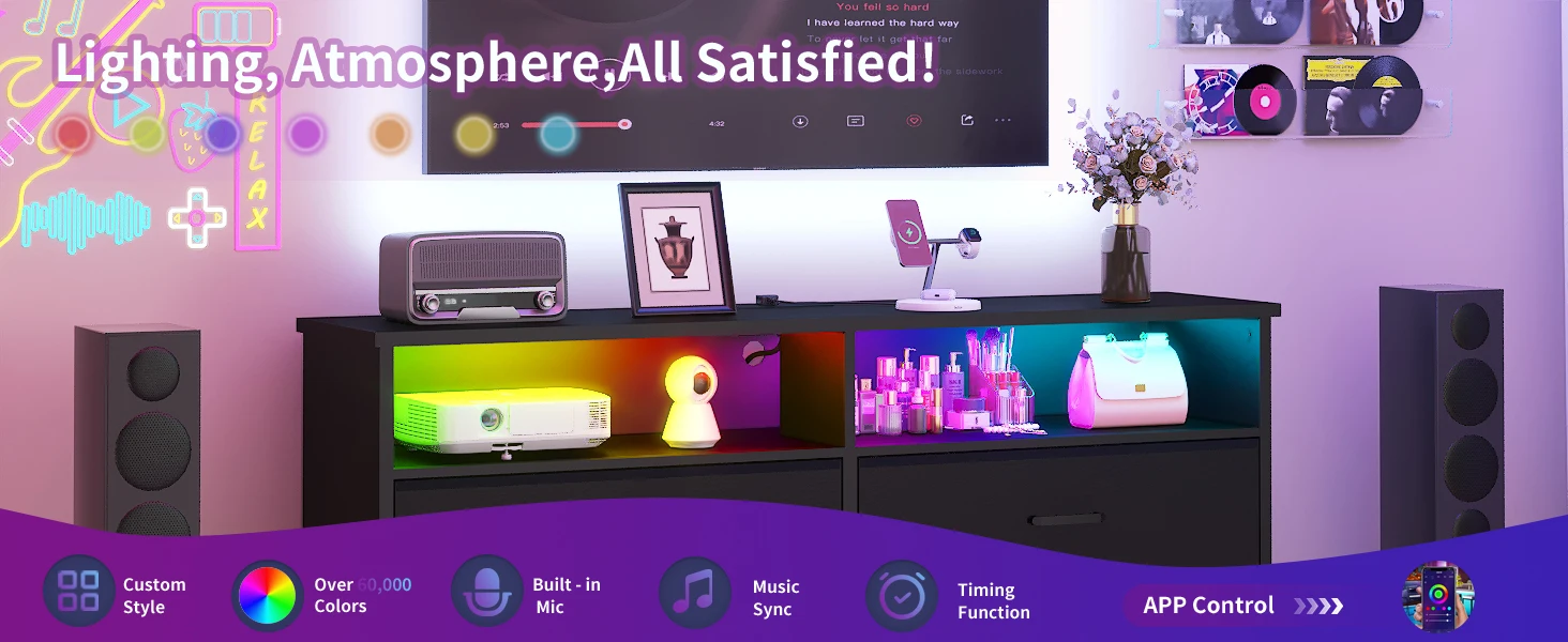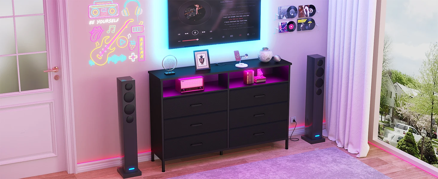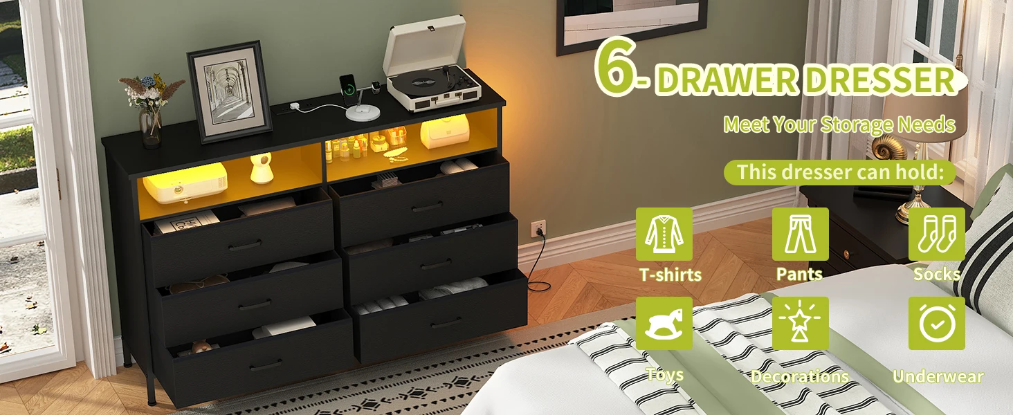 bedroom, Fabric Black Bedroom Dresser with LED Lights and Charging Station, 6 Long Drawers Dresser, Tall Wide Chest of Drawers S