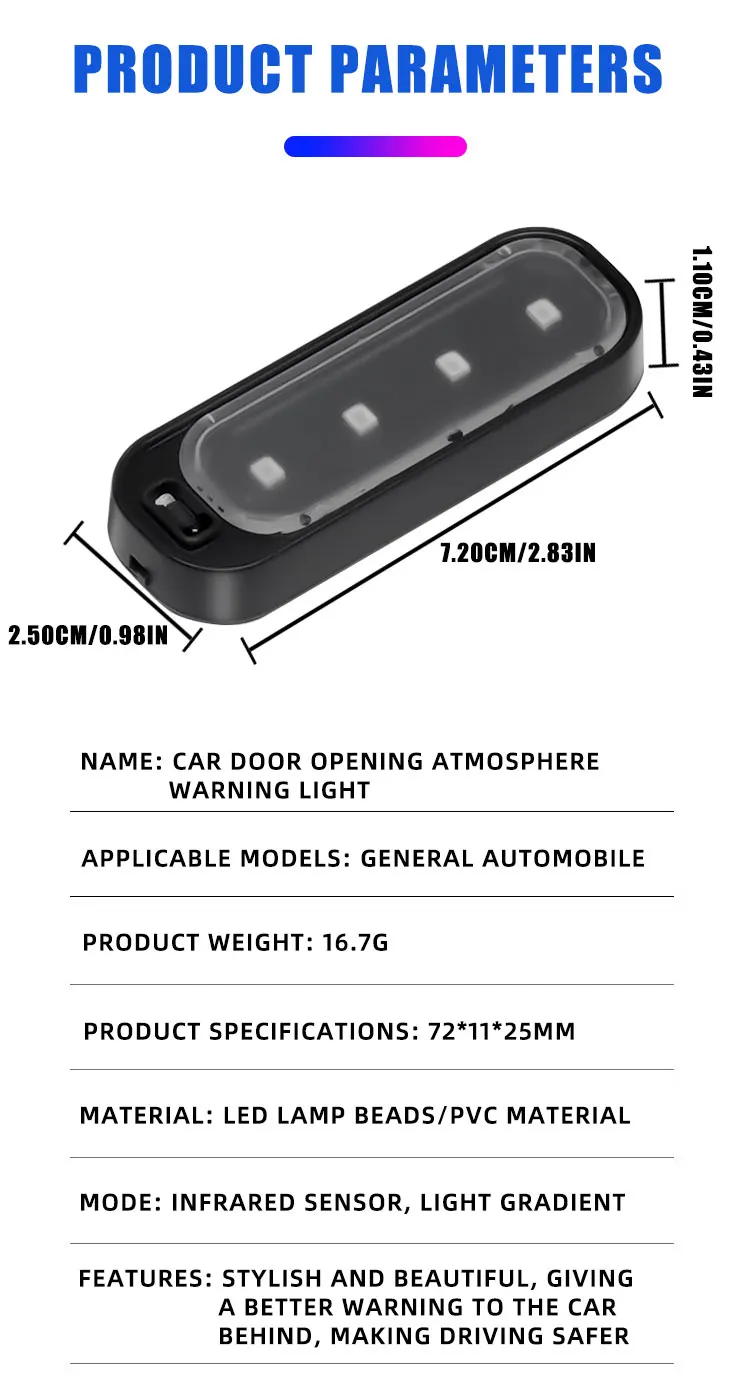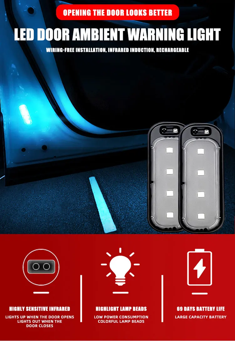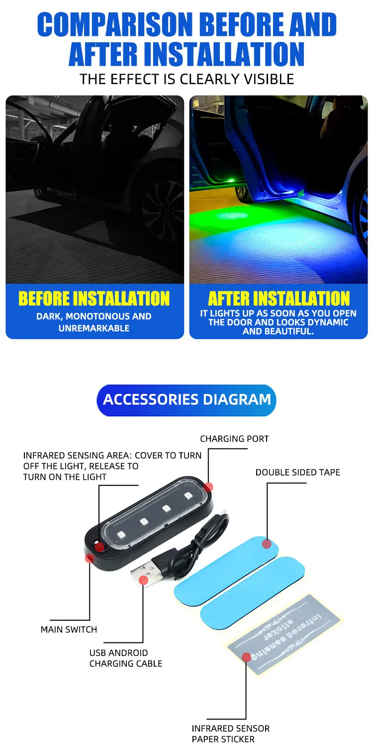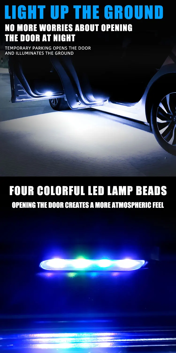 2.Induction switch design, open the door and the door is on/off when the door is closed, the door is automatically turned on, and the ground is irradiated with a clear view to avoid stepping on splashing puddles or gravel and causing feet;