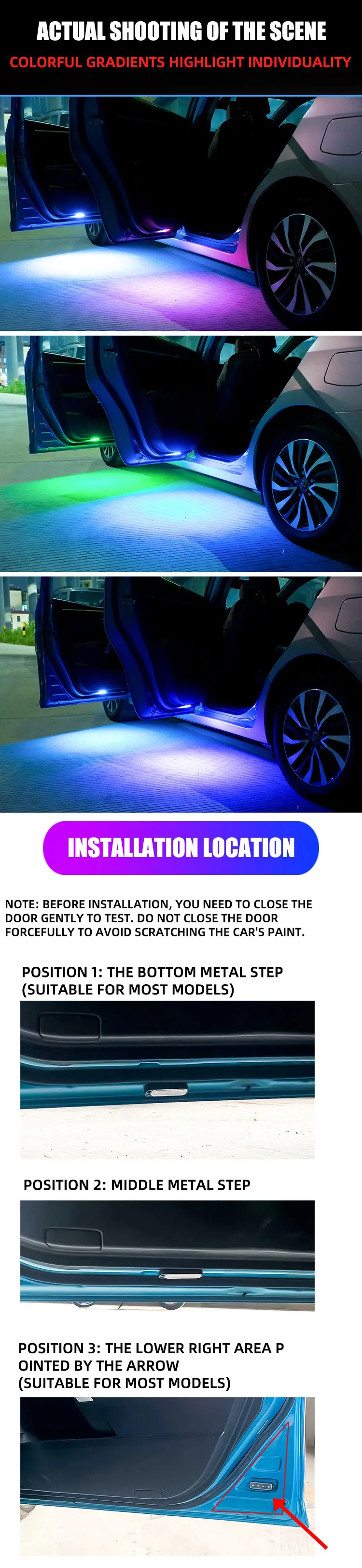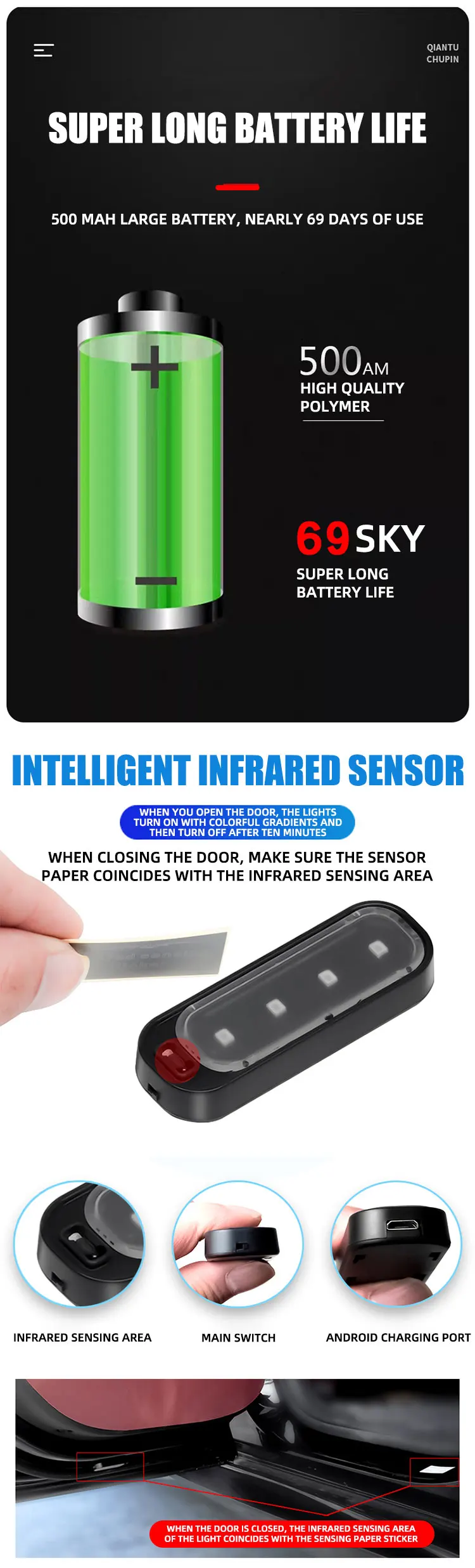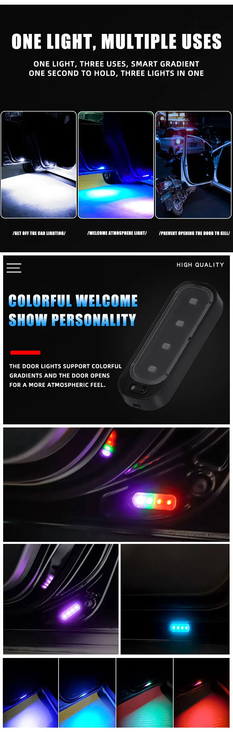 2.Induction switch design, open the door and the door is on/off when the door is closed, the door is automatically turned on, and the ground is irradiated with a clear view to avoid stepping on splashing puddles or gravel and causing feet;