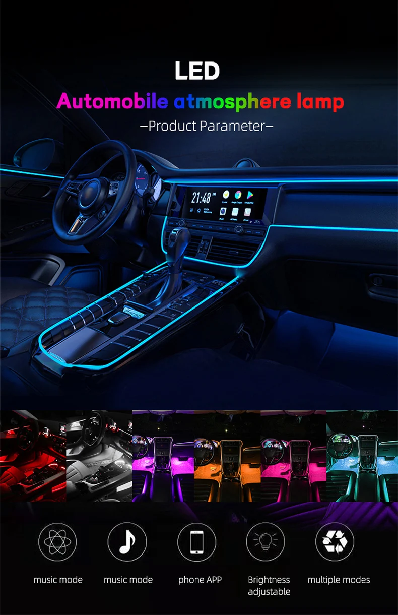 Car Interior Neon RGB Led Ambient Light Fiber Optic Kit With APP Sound Control Multiple Modes Auto Atmosphere Decorative Lamp