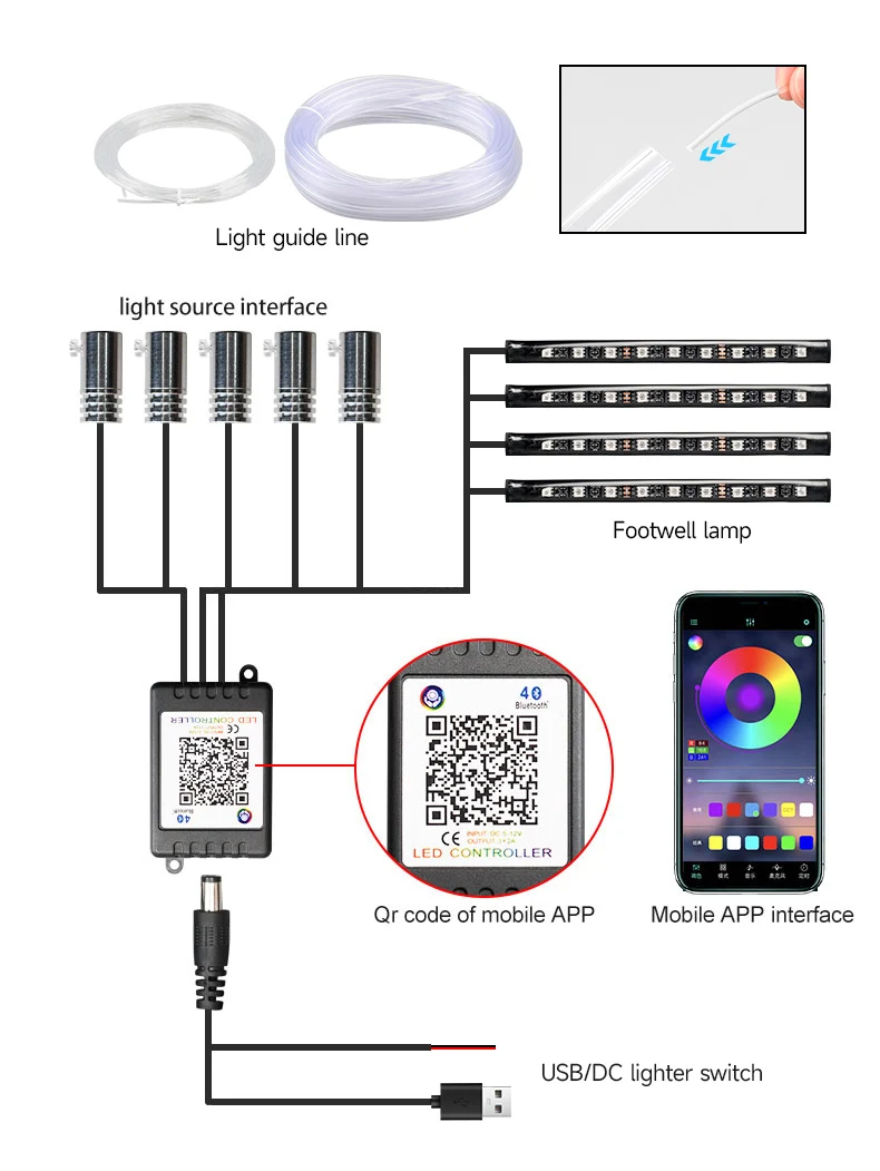 • Fiber Optic Kit :The product comes with a fiber optic kit that can be installed in your car's ceiling or other areas to create a unique lighting effect.