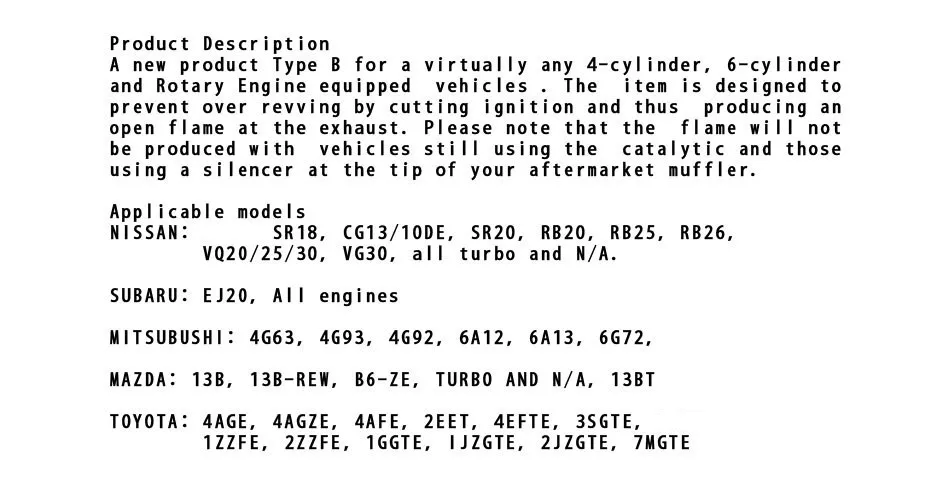 A new product Type B for a virtually any 4-cylinder, 6-cylinder and Rotary Engine equipped vehicles.