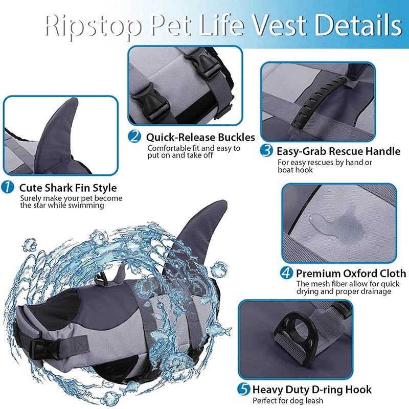 Dog Life Jacket Ripstop Shark Vests Shape Dog Lifesaver With Rescue Handle Pet Safety Swimsuit For Swimming Pool Beach Boating