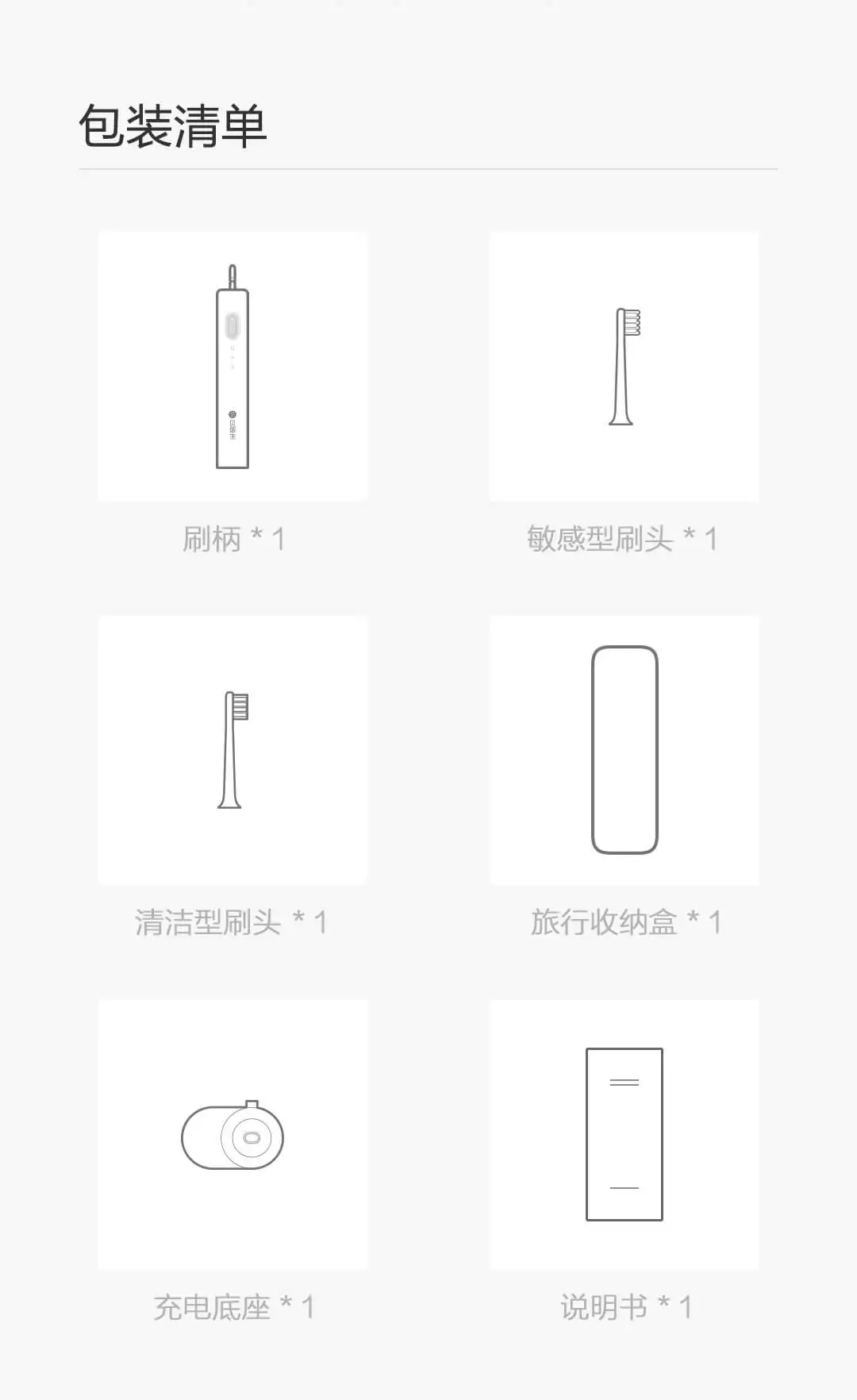 Brush handle*1 sensitive brush head*1 cleaning brush head*1 travel storage box*1 charging base*1 manual*1