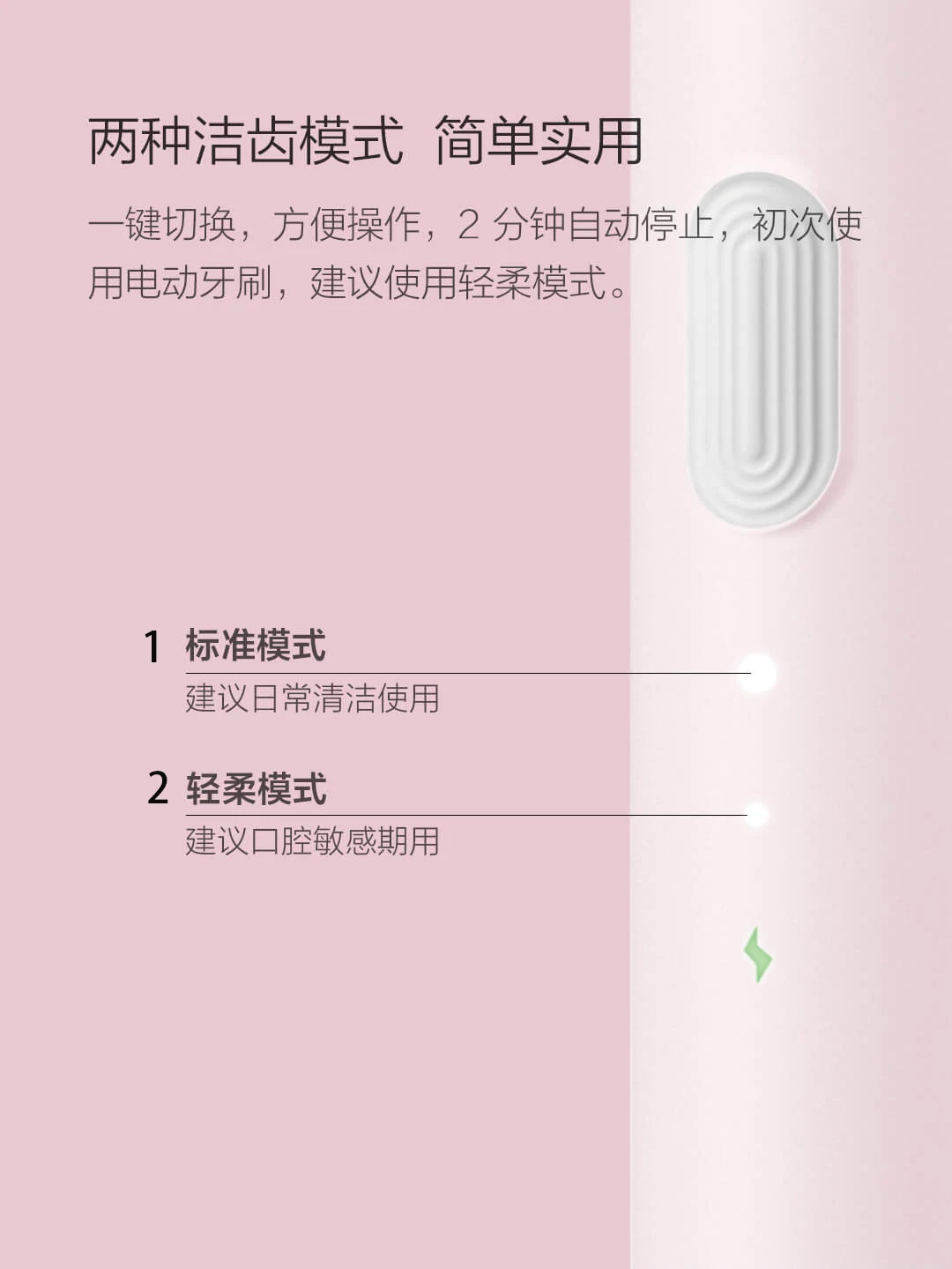 The two cleaning modes are simple and practical. One-key switching, convenient operation, automatic stop in 2 minutes, the first time you use an electric toothbrush, the gentle mode is recommended. 1 The standard mode is recommended for daily cleaning. 2 The gentle mode is recommended for oral sensitive periods.