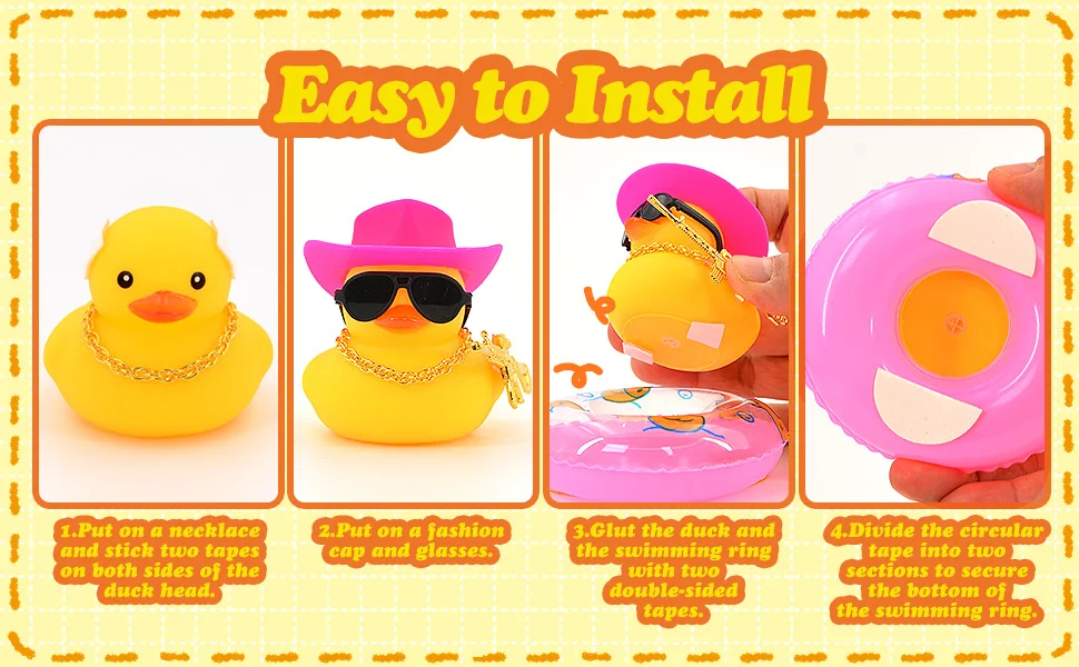 5. Need to Assemble: Put the necklace on the duck, fix the mini crown on the duck head with tape, stick the swimming ring to the bottom of the duck, and then fix the swimming ring with double-sided tape.