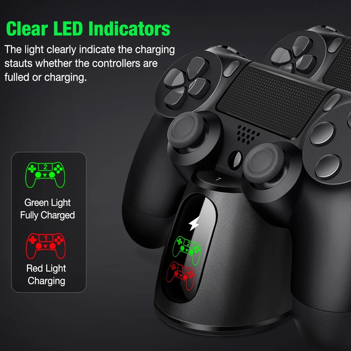【Led indicator charging stand】-- built-in LED Indicator in the font screen clearly indicate the charging status, USB cable connects the charging the "controller" Turns to green color, plug in the controller turns to red color, charged fully turns to green color again, It helpful to know the status