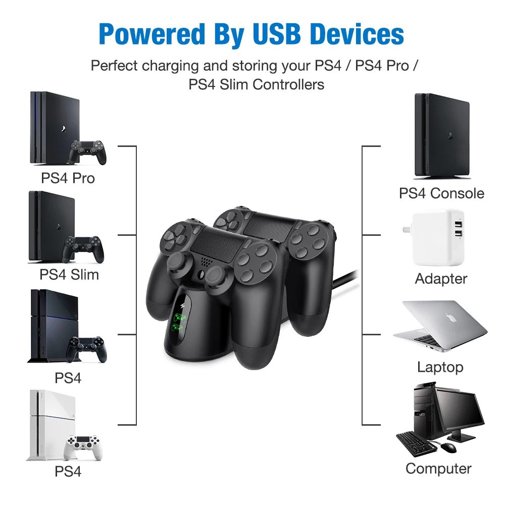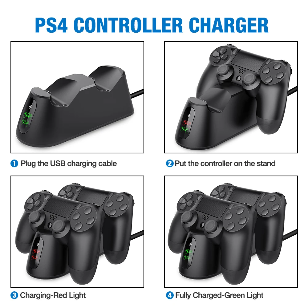 【Fast charging dock for PS4 controller 】-- 2-hour Fast wireless charging with 2 built-in Micro USB adapter ports, The Pro charger is perfect compatible for dual shock 4 PS4/ PS4 Slim/ PS4 Pro controllers, save your time for two controllers charging simultaneously