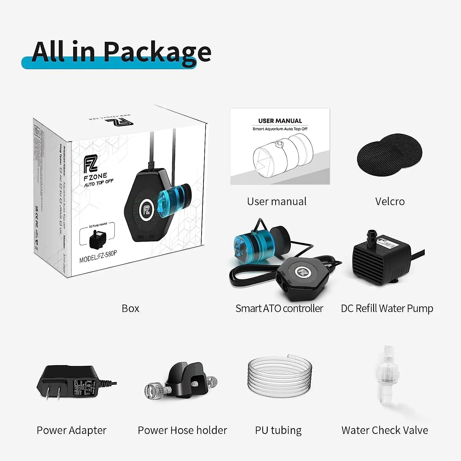Upgraded 2.0 ATO with Independent Controller: The auto top off system effectively monitors and replenishes evaporated water on a daily basis, providing a convenient and time-saving solution for both saltwater and freshwater tank fish keepers, particularly during business trips or holidays. With its upgraded 2.0 version, the ATO is equipped with an enhanced visual interface, allowing you to easily initialize, pause, or resume the device using the FZ button.