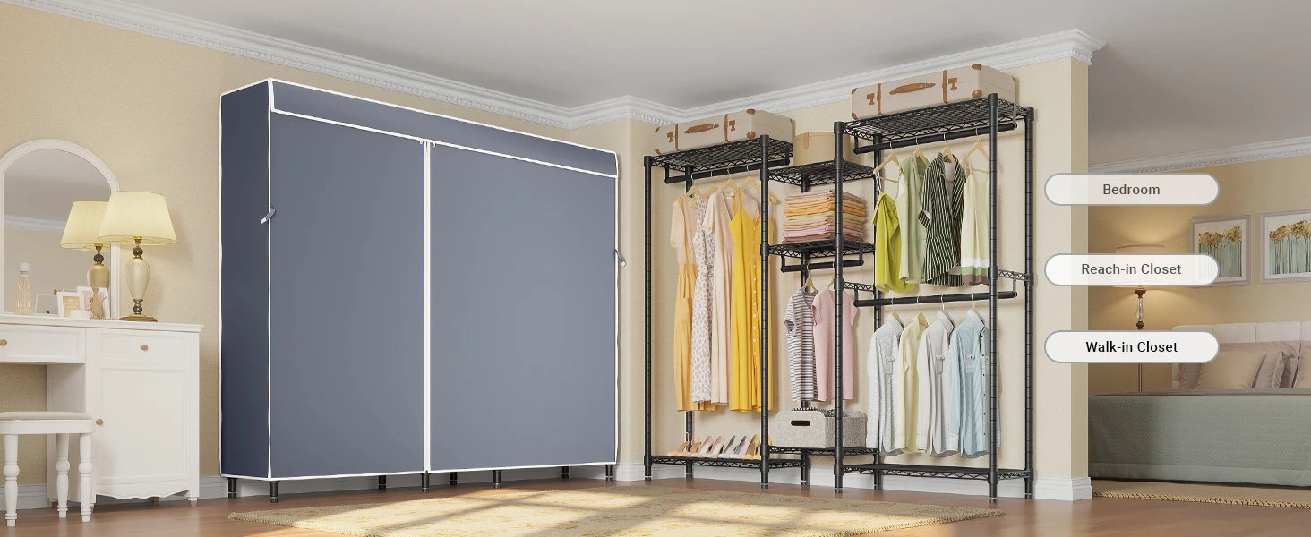 Heavy Duty Covered Clothes Rack Portable Wardrobe Closet, 5 Tiers Wire Garment Rack Black Metal Clothing Rack