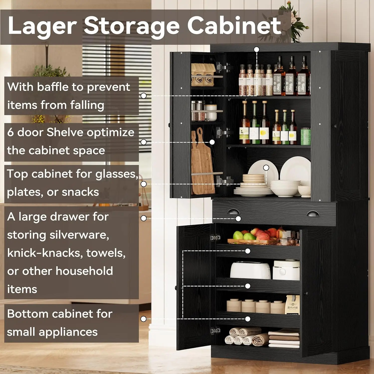 Ample Storage Capacity: The kitchen pantry has a big slide-out drawer, 6 door shelves, and 3 Push-pull storage racks. It is perfect for storing food, small appliances, and kitchen supplies. The large center drawer in the middle can hold your favorite cutlery.