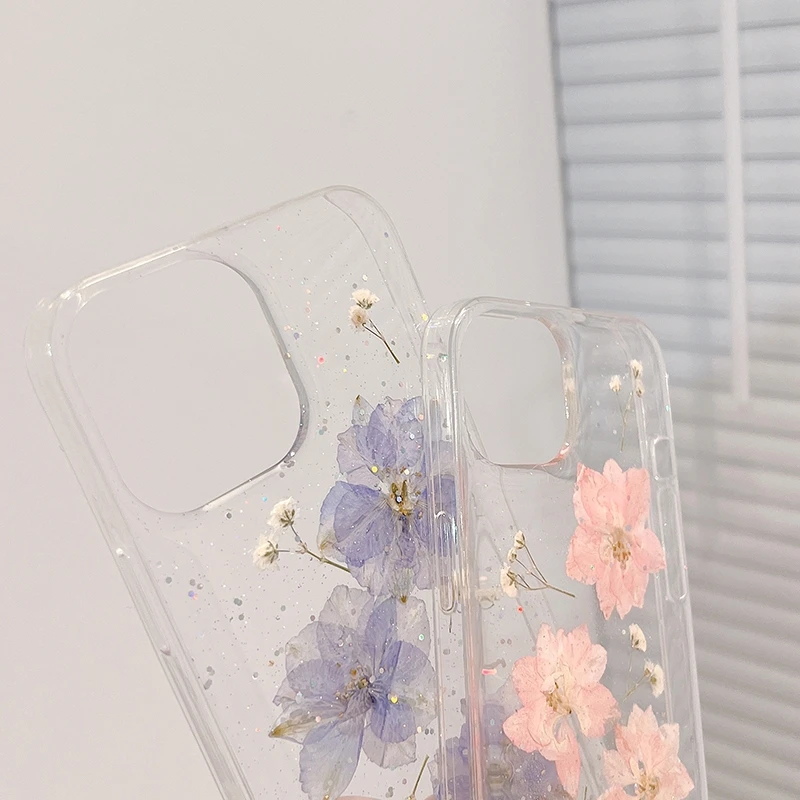 Korea Glitter Dried Floral Phone Case For iphone 15 14 13 12 11 Pro Max X XS XR 7 8 Mini Plus Cute Girl Epoxy Clear Soft Cover