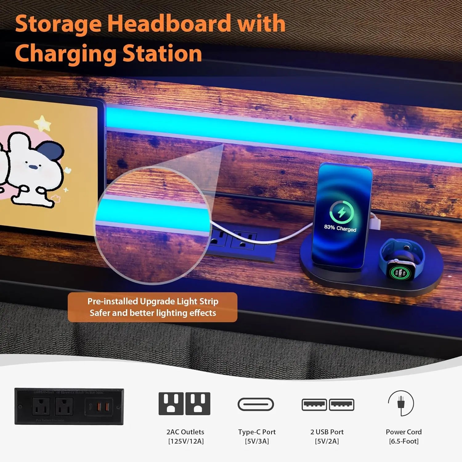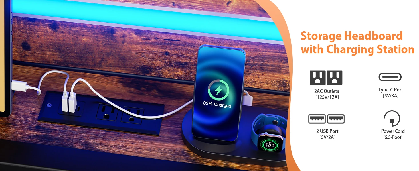 1 Upholstered Headboard 2 Embeded Design 3 Charging Station