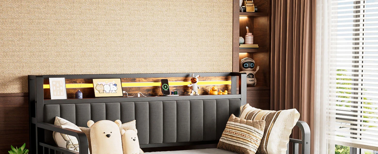 LED Light, Heavy Duty Metal Twin Bed Frame with Upholstered Storage Headboard & Charging Station, Day Bed Pop Up Trundle Bed Twi