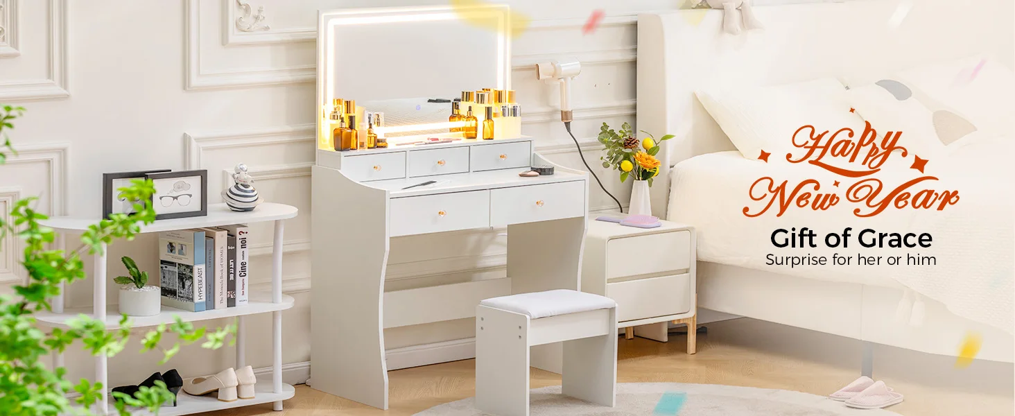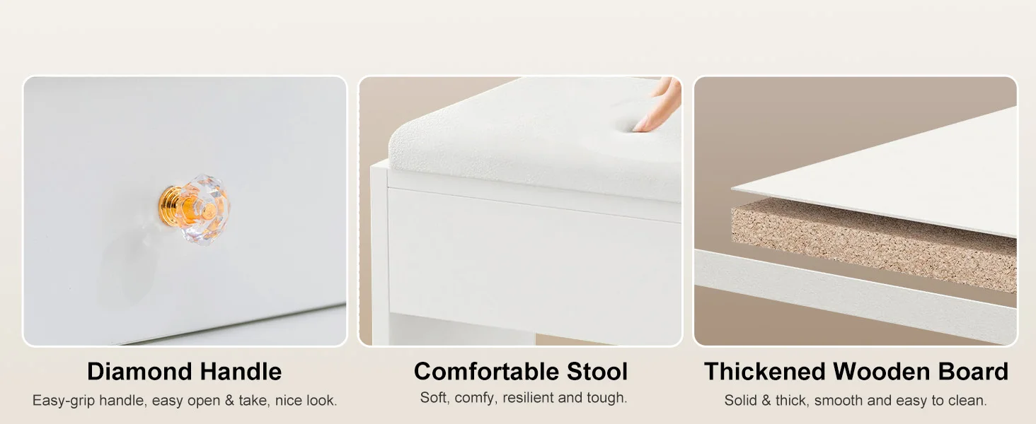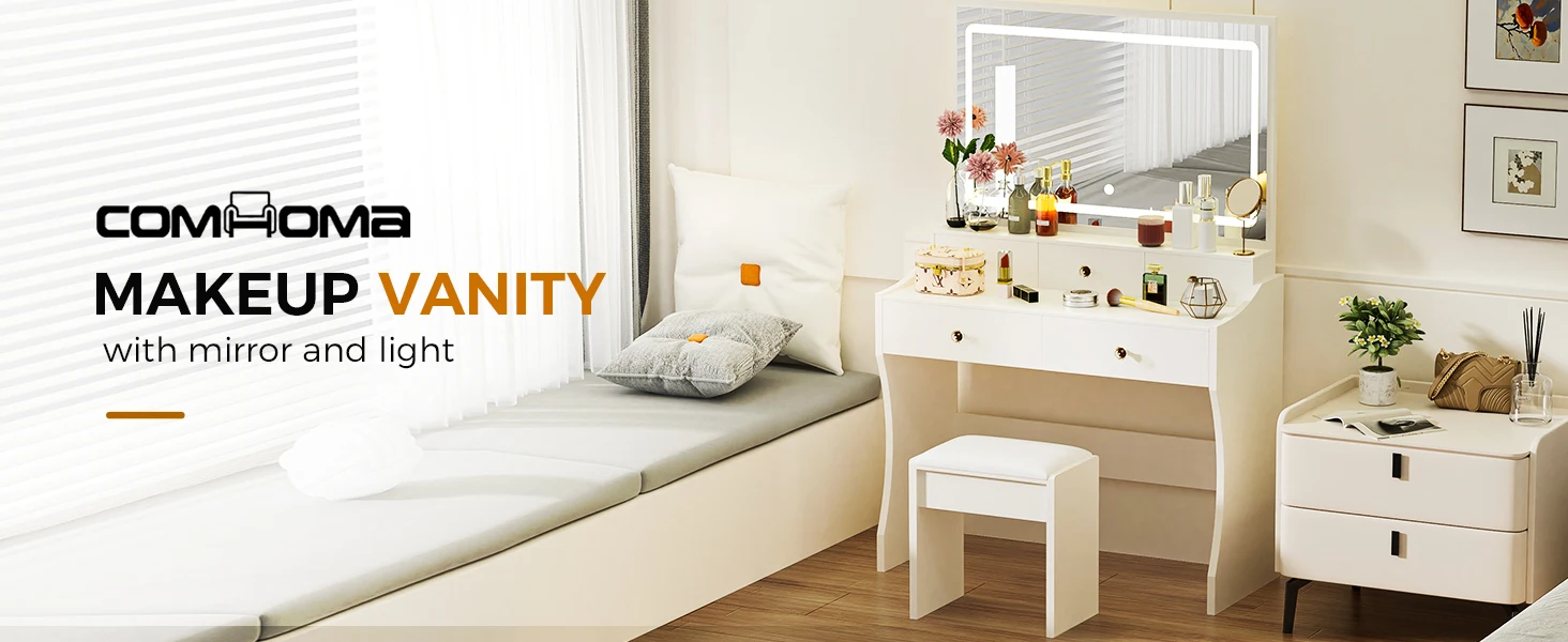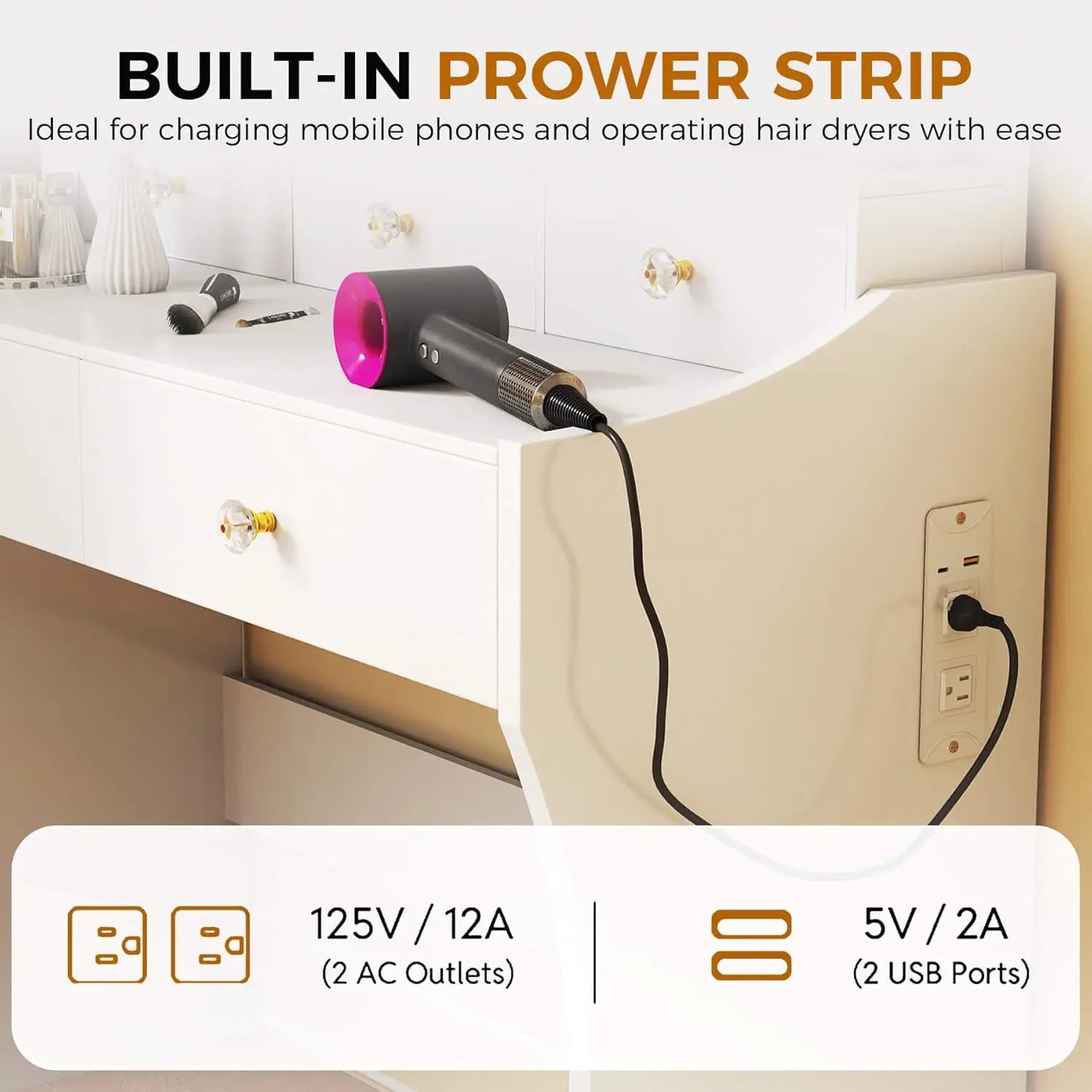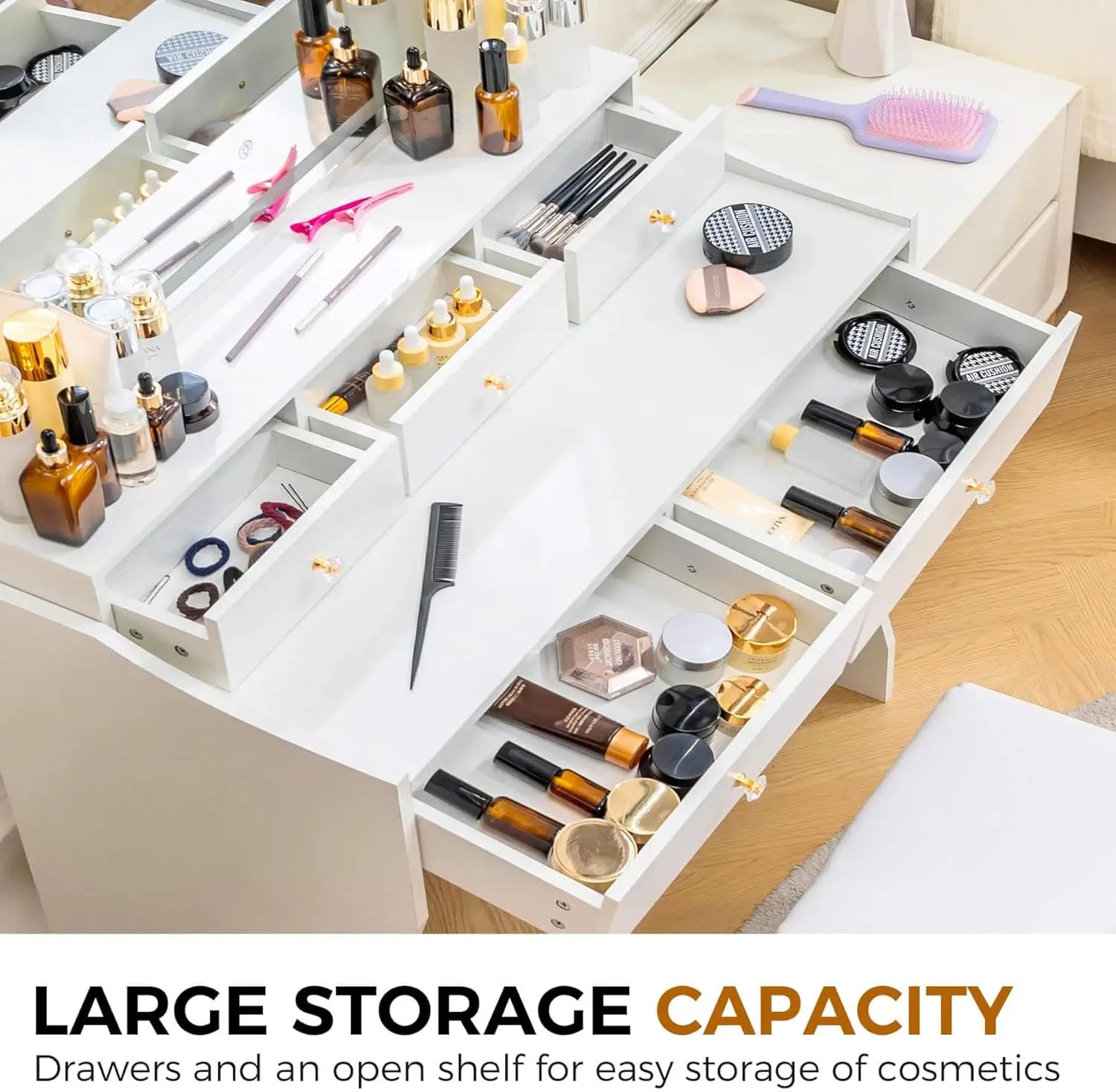 Makeup Vanity Desk with Mirror and Lights, Vanity Table and Chair Set with 5 Drawers and Charging Station, Bedroom Dresser LED M