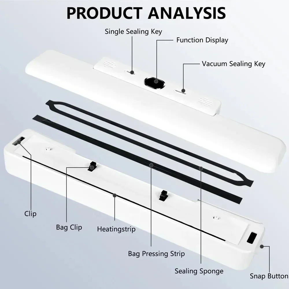Vacuum sealer Combined vacuum and sealing for dry and wet food, prolonging the freshness of a variety of foods such as meat, cooked foods and vegetables, etc. The vacuum sealing machine reduces food waste, keeps food fresh, prevents odors in your refrigerator and keeps it clean.
