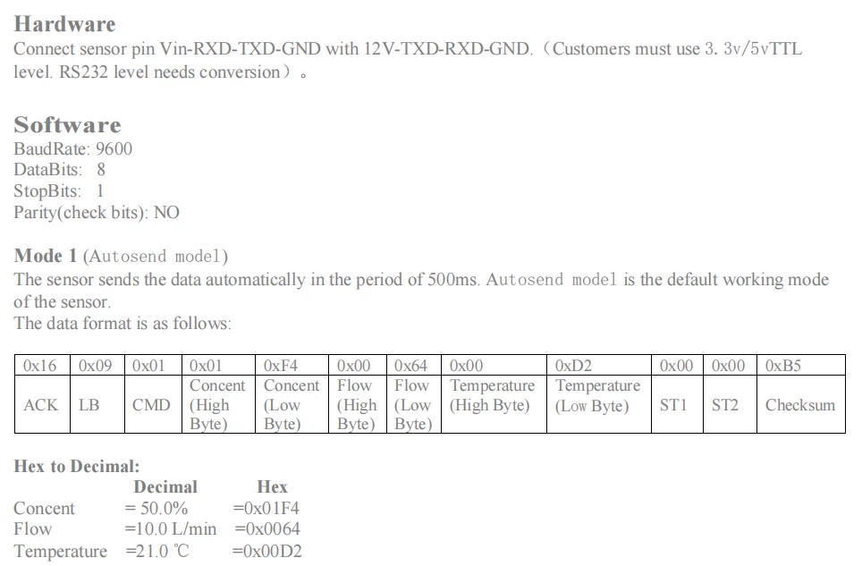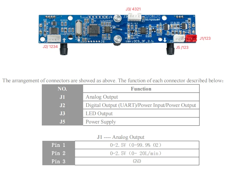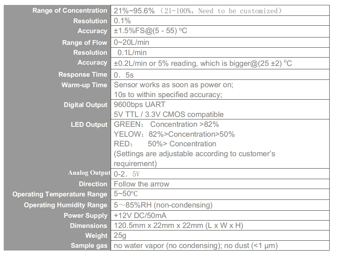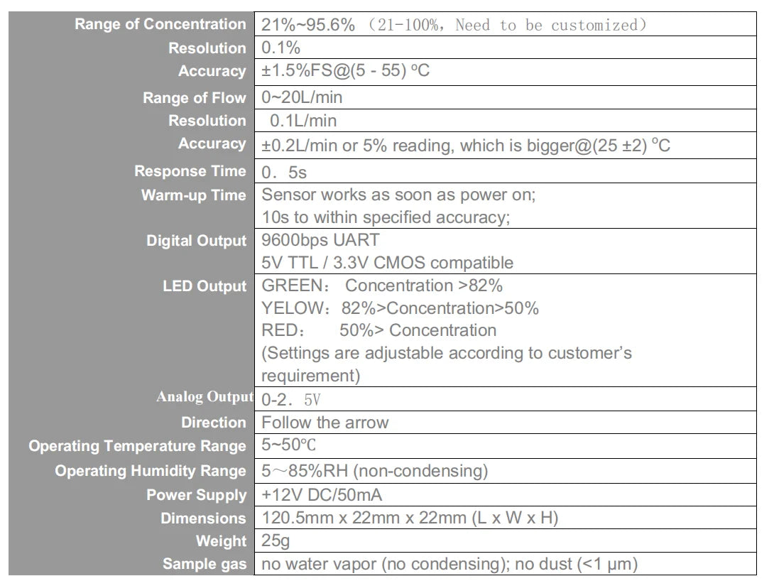 concentration and flow of the PSA oxygen generator. It uses UART digital output, analog