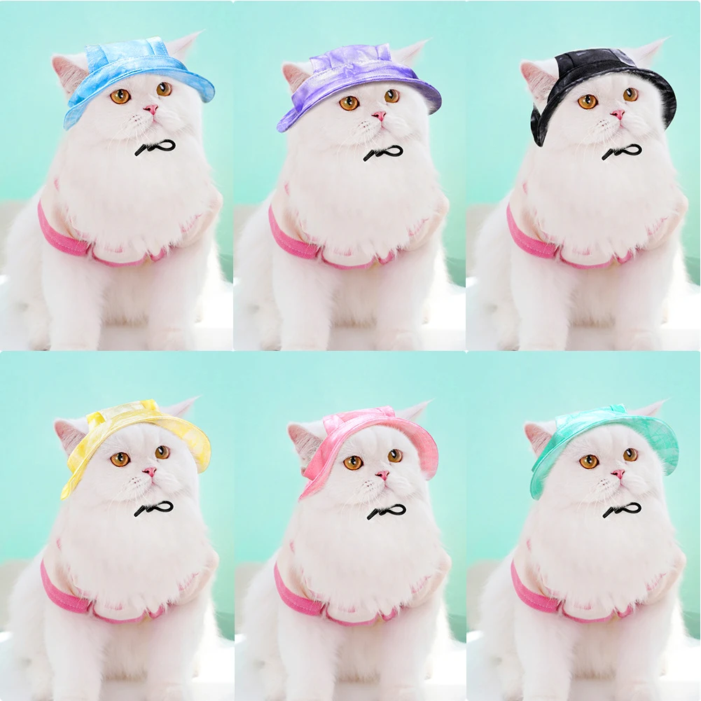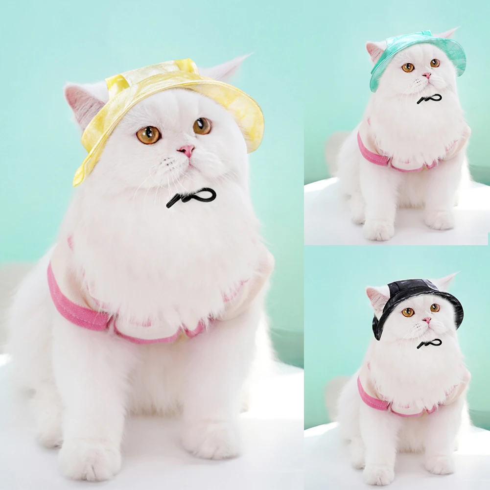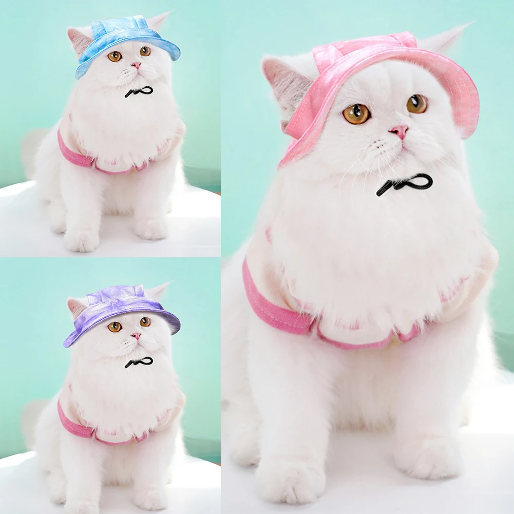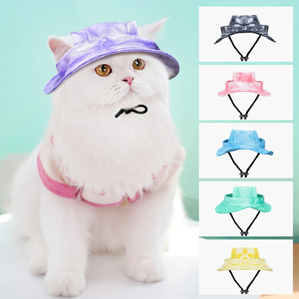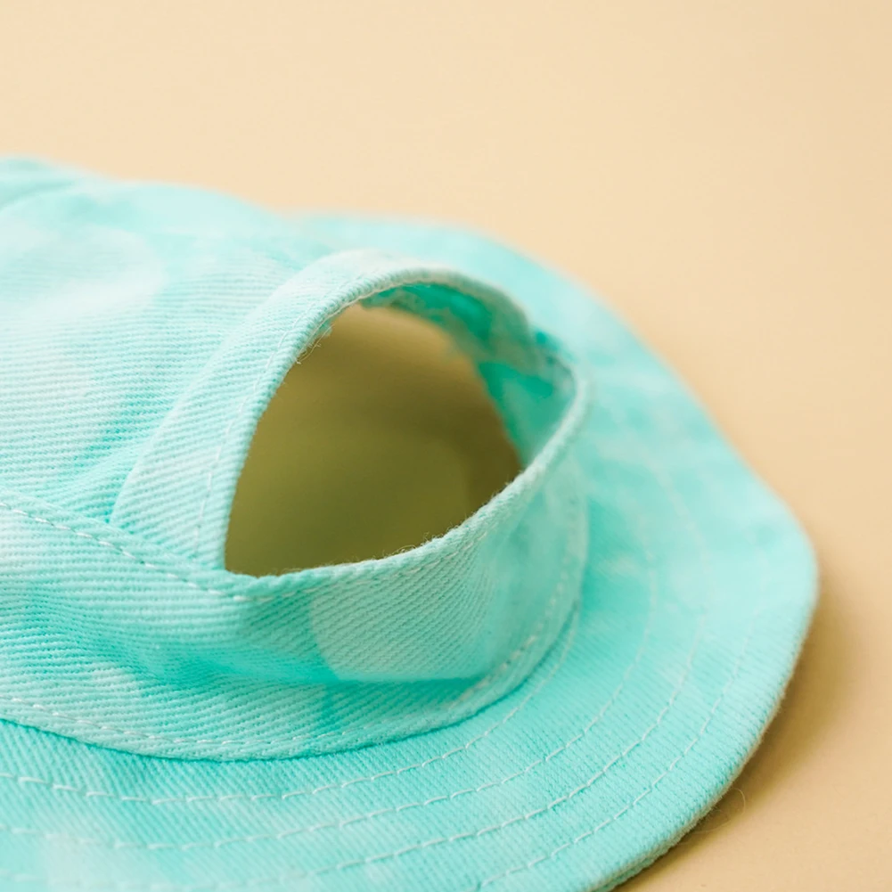 - Pet hat with cutouts for ears, large brim, lace-up style, adjustable size.