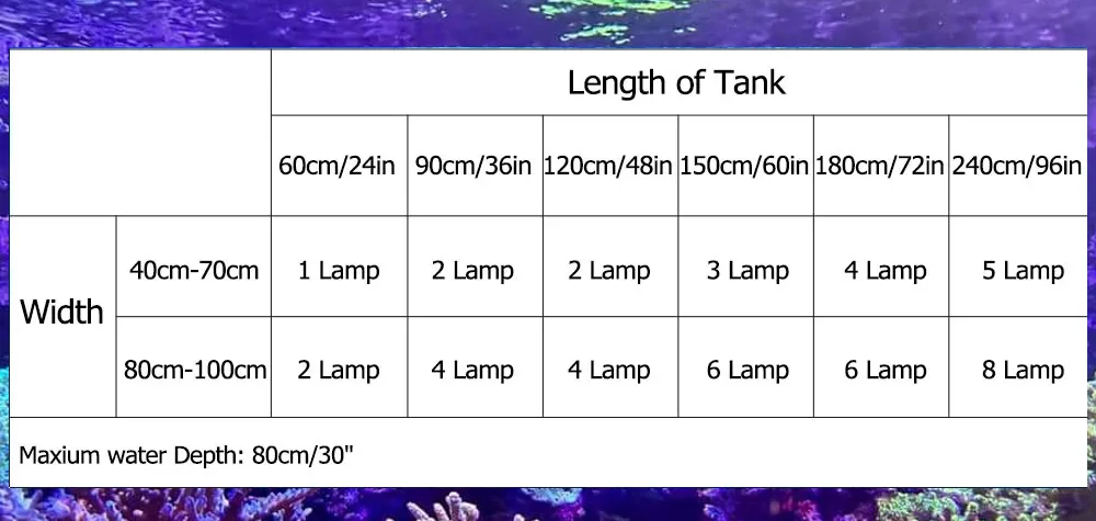 One RL90 light recommended spread 60cm x 60cm x 60cm. Multiple modules can be used and are recommended to cover larger tanks.