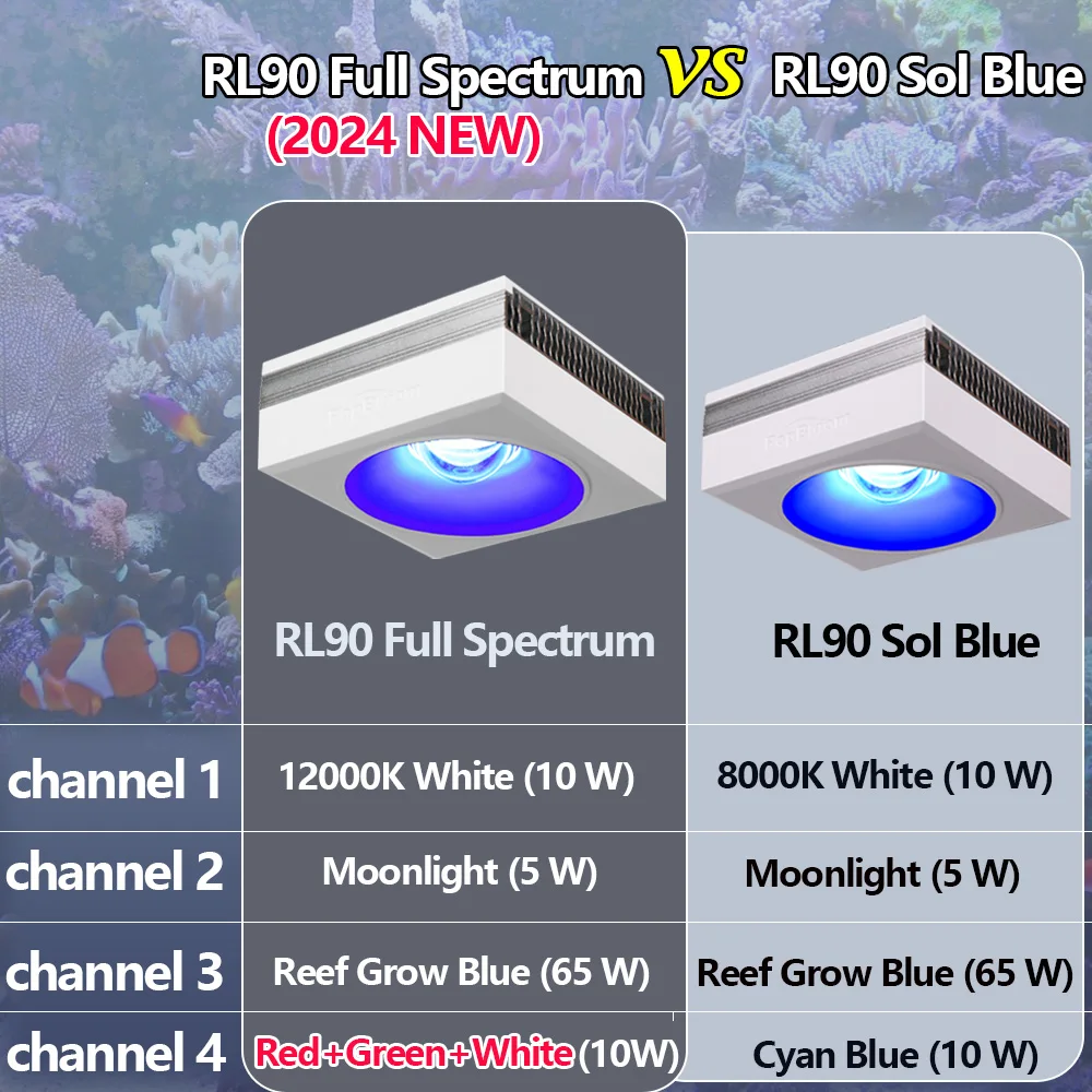 The RL90 Full Specturm provides 4 channels, ReefLED90 has 3 channels. RL90 Full Specturm have same sprectrum as ReefLED90 when RL90 is turn off at channel 4.