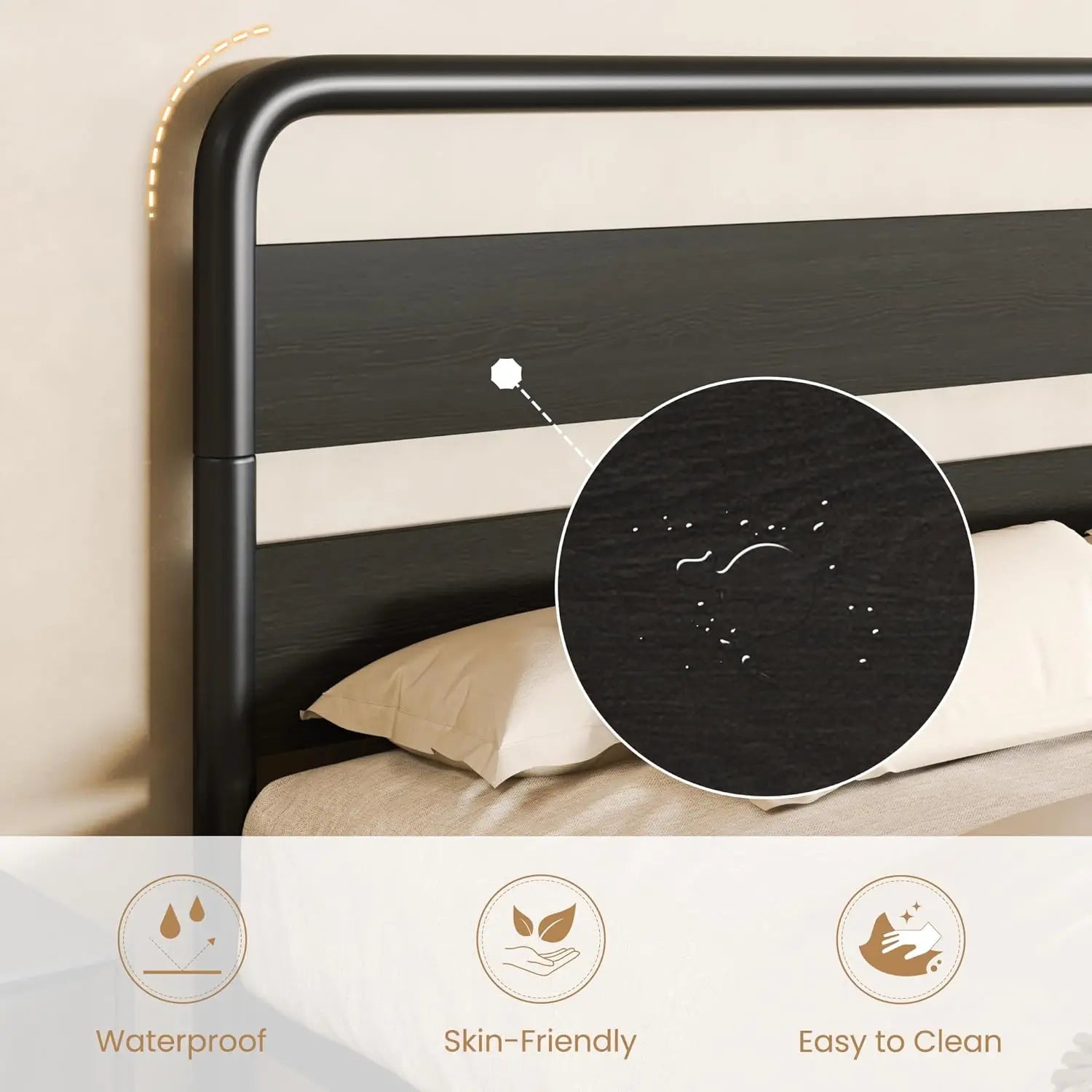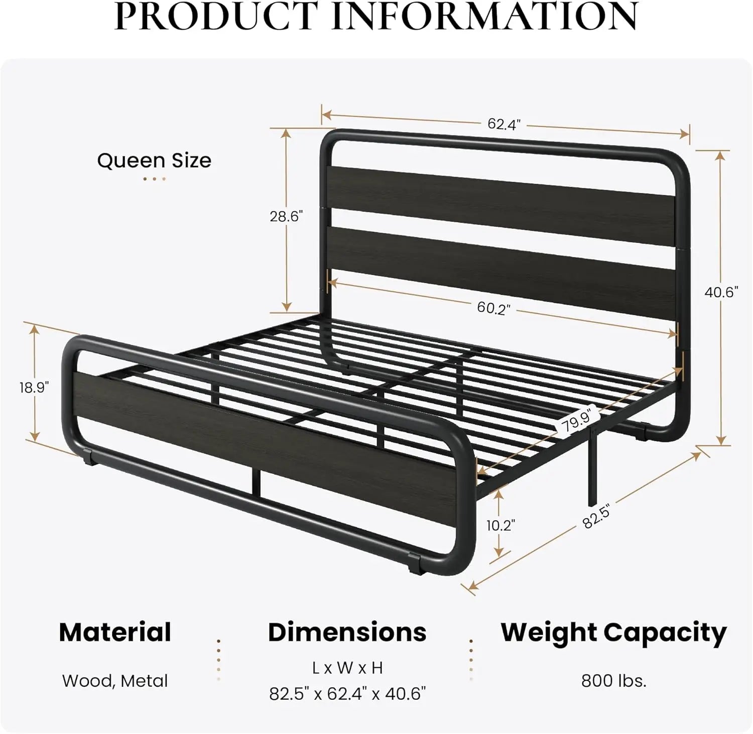 Queen Size Metal Bed Frame with Wooden Headboard , Heavy Duty Oval-Shaped Platform Bed with Under-Bed St