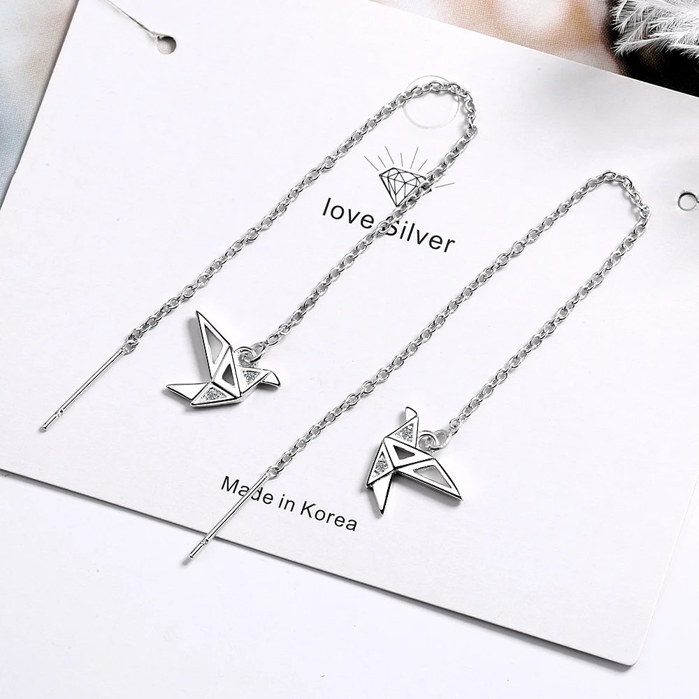 Real. 925 Sterling Silver Fine jewelry origami paper crane dangle earrings Threader GTLE2743