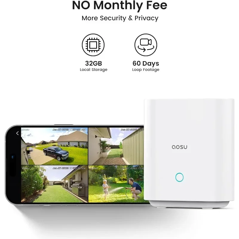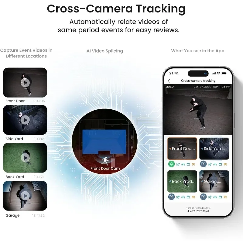 New Experience From AOSU: 1. Cross-Camera Tracking* Automatically relate videos of same period events for easy reviews. 2. Watch live streams in 4 areas at the same time on one screen to implement a wireless security camera system. 3. Control the working status of multiple outdoor security cameras with one click, not just turning them on or off.