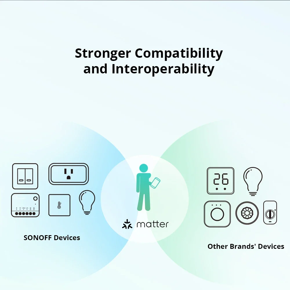 Matter-certified SONOFF devices can recognize and work with other brands of matter end products, these devices are available on all Matter-enabled platforms.You can integrate them into the apps you want, such as Apple Home, Google Home and Alexa, etc.Controlling all smart devices through one app is no longer a fantasy.