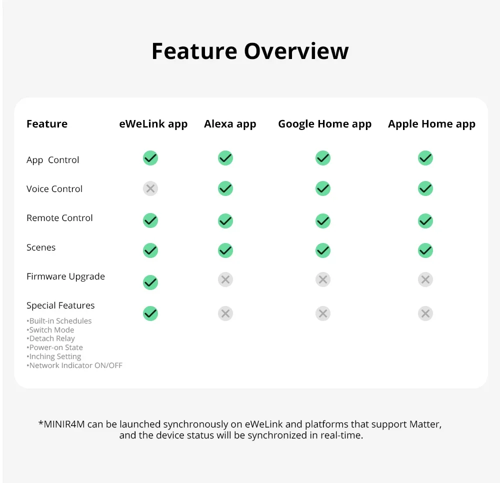 MINIR4M is SONOFF's first Matter device, it can recognize and work with other brands of Matter end devices, and integrate into Matter-enabled platforms, such as Apple Home, Google Home, Alexa, etc. Controlling all smart devices through one app is no longer a fantasy. Matter-certified devices support local communication in the home network, even if the network is disconnected, MINIR4M still works normally, with faster responsiveness and better reliability. Adding MINIR4M to Matter-compatible Apps is easy. Simply scan the provided Matter QR code with your Matter-Compatible App and MINIR4M is easily configured by following the steps of the App.