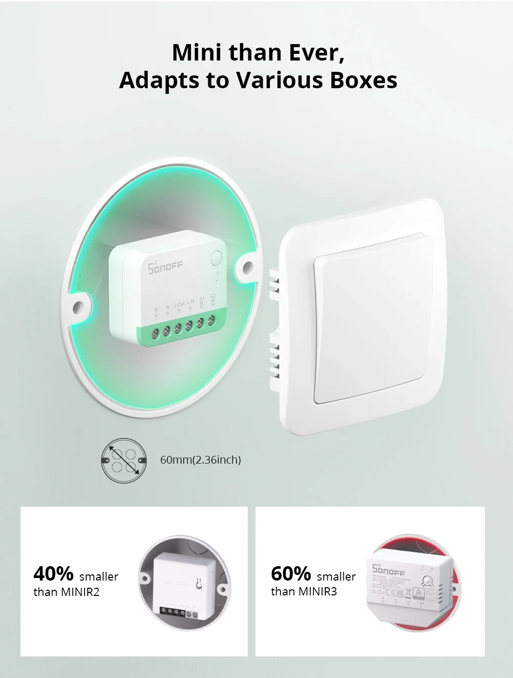 A brand new product that turns traditional switches into smart switches, automating lights and electronic devices. It’s 40% smaller than MINIR2, fits in various mounting boxes, including the smallest European standard ones.
