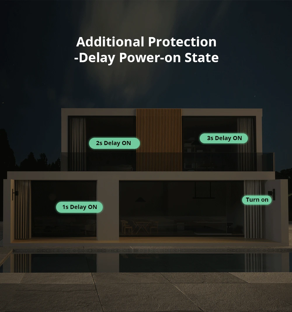 If power is restored after a power outage, set some appliances to delay the execution of the power-on state. Avoid all appliances turning on simultaneously, causing high currents to damage appliances and leaving potential safety hazards.