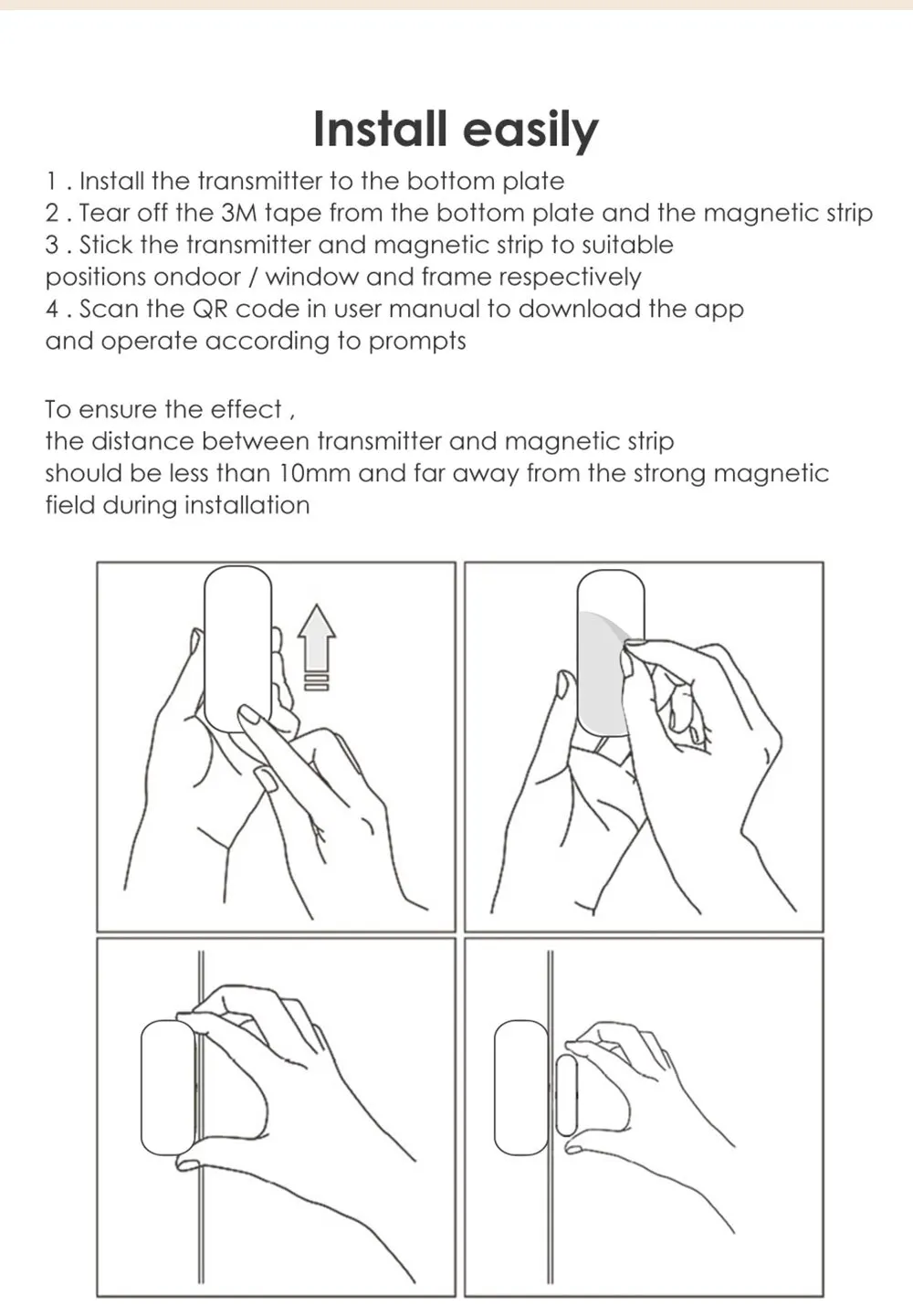 No complicated installation tools are required. The sensor can be installed with double-sided adhesive tape or screws(included) in just a few steps, and download an app "tuya" or "Smart Life" from GooglePlay or App Store to add the device to detect the status of your door/window.