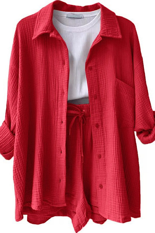 This two-piece set features a relaxed button-up shirt paired with drawstring shorts for an effortless casual look. The soft fabric and comfortable fit make it ideal for everyday wear or lounging.