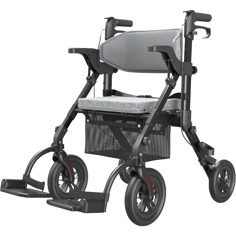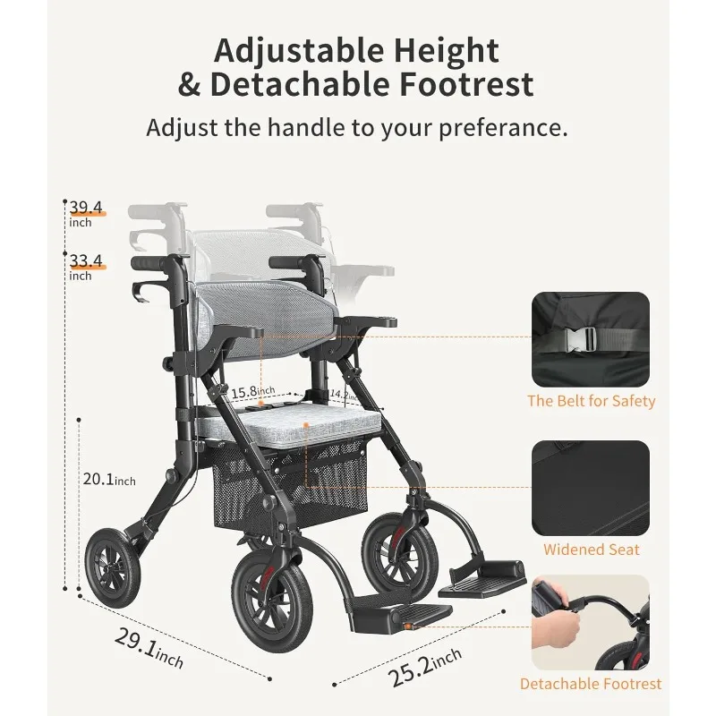 - 2 in 1 Rollator Walker for Seniors:Our 300Lbs Load Capacity Rollator-Transport Chair offers an innovative and practical solution that combines the mobility support of Walkers For Seniors With Seat and the comfort of a transport chair in a single product. This versatile design allows seniors to maintain an active lifestyle while ensuring they can take breaks and sit down whenever necessary, promoting independence and confidence in their daily activities.